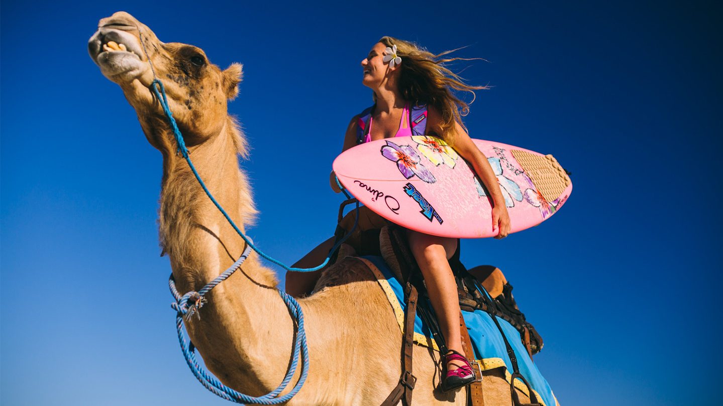 AT: With the nickname Indiana Jane, I feel it is my dream (and duty) to one day visit the Great Pyramids of Egypt! I spent my time at UC Berkeley studying Egyptology and culture. One day, I dream of riding a camel across the Egyptian desert with my pink surfboard under one arm and my camera under the other and watching the blood red Egyptian sun dip behind the pyramids. I believe we can learn a lot from the Egyptian connection with the rhythms of nature and astronomy.
