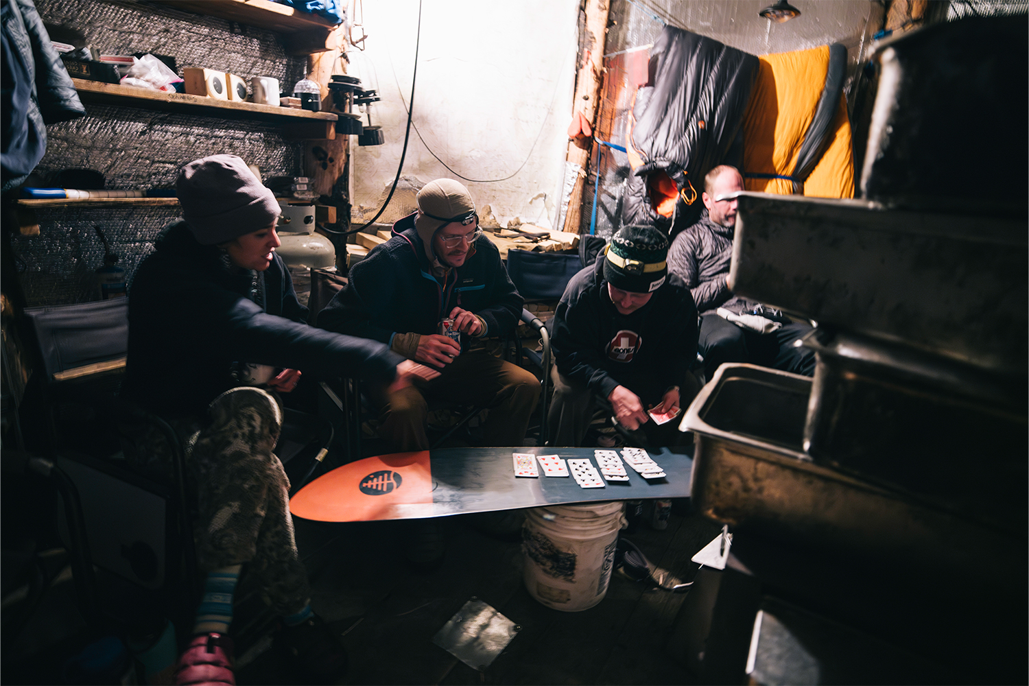 Inside the yurt were simple accommodations: bunk beds, drying lines, a small wood stove upstairs, a propane stove, pots and pans and chairs for hanging out downstairs. Despite the rustic setting and simple amenities, it truly was all we needed. At night we would plan routes, fix gear, dry sweaty layers, eat hearty meals and enjoy card games with friends, before crashing early for another big day.