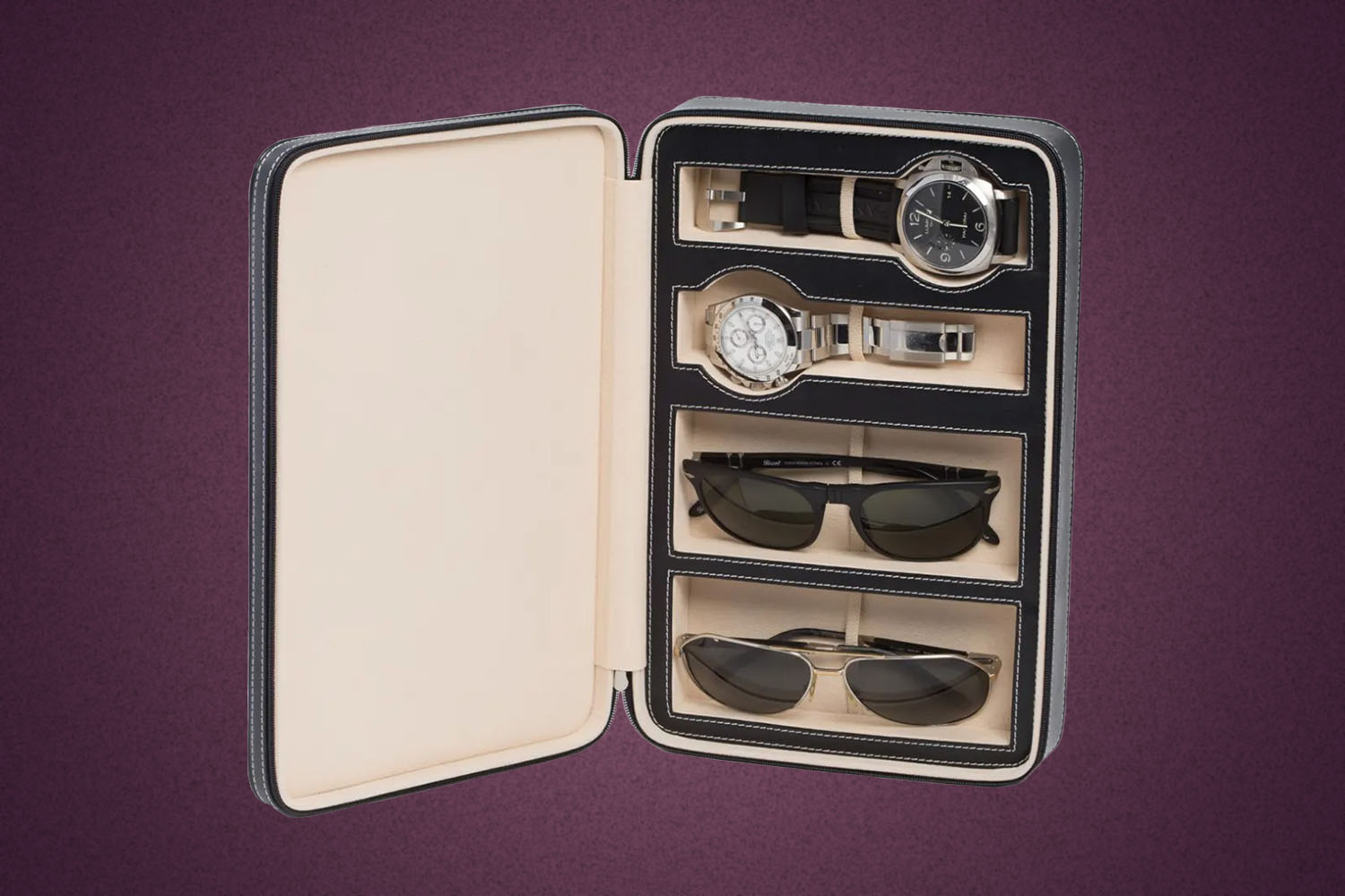 Multiple sunglass and watch options are very much a nice-to-have when traveling, but admittedly a pain in the neck to pack effectively — no one wants to be throwing expensive eye/wrist wear in their dopp kit. No more with this handy case from Bey-Berk, which keeps two of each snug and protected without taking up too much space in your bag.