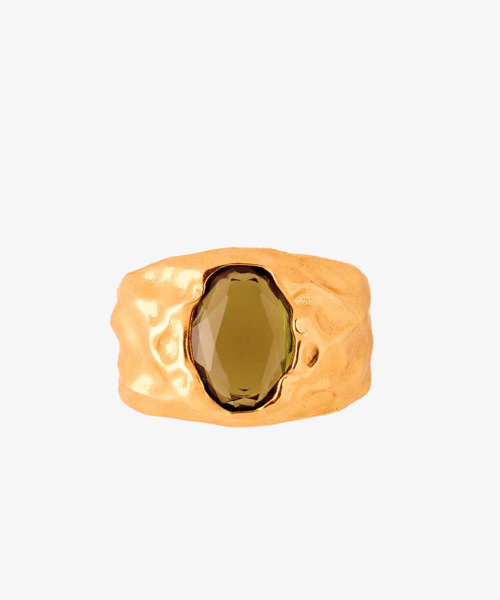 A bold finger accessory set with a colored stone on a thick, textured band.