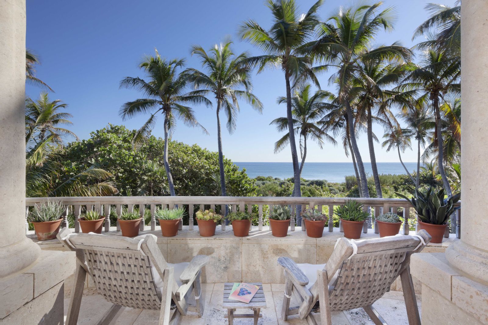 In the center of the property lies the coral-clad main residence with 12 bedrooms and 12 full and nine half bathrooms. The shell-stone and marble exterior, coupled with the tropical wood interior, gives the home an elegant and inviting appearance. The top floor is arranged into two separate suites—each with a wet bar, kitchenette, three bedrooms, and spa-style bathrooms. The main master bedroom opens to a loggia, with sweeping views of the Atlantic Ocean.