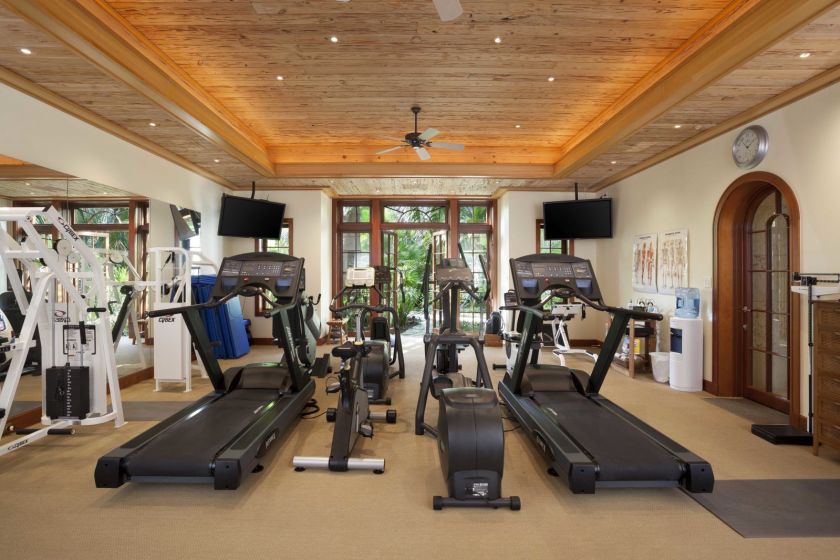 Blending into the home’s lush tropical exterior, the patio opens to a cushy indoor/outdoor space fringed with a jungle-like garden. The luxurious pool is accompanied by two changing rooms, a two-room gym, mahogany bar, spacious lounge area with fireplace transitions, and an indoor palm garden.