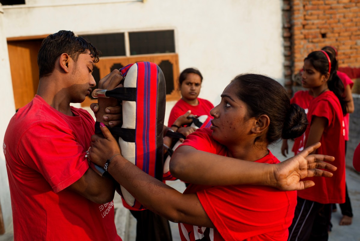 Usha, the 26 year old leader of the grassroots Red Brigade, teaches the art of self-defense to other members of the Red Brigade. (Jonas Gratzer/LightRocket via Getty Images)