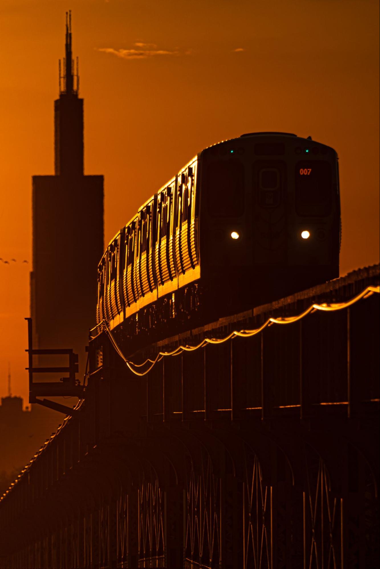 Sunrise on the L was captured on the West Side and shows two iconic Chicago landmarks, the L and the Sears Tower [now called the Willis Tower]. A lot of people say it references Batman and Gotham City, but there aren’t any effects — this is actually how it looked. This shot reminds me of how I would take the L from Kennedy-King College to the Loop and how much the city’s neighborhoods changed in those 25 minutes.