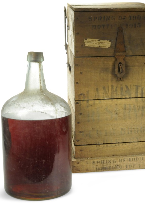 For Kentucky whiskey lovers, Christie’s has a unique item up for auction in its online-only “All American Sale.” The lot includes a two-gallon jug of Plankinton Reserve from the Cedar Brook Distillery in Lawrenceburg, Kentucky, distilled in the Spring of 1903 and bottled in 1915, along with its original wooden case. The straw-lined wooden presentation case includes a stamp confirming that it was inventoried “Under Act of Congress Oct. 3, 1917″—i.e. three years prior to Prohibition. The whiskey was distilled especially for Milwaukee’s Plankinton House Hotel, opened by meatpacking tycoon John Plankinton. The auction ends on July 12. Click here to place a bid. To browse all the other lots, click here.