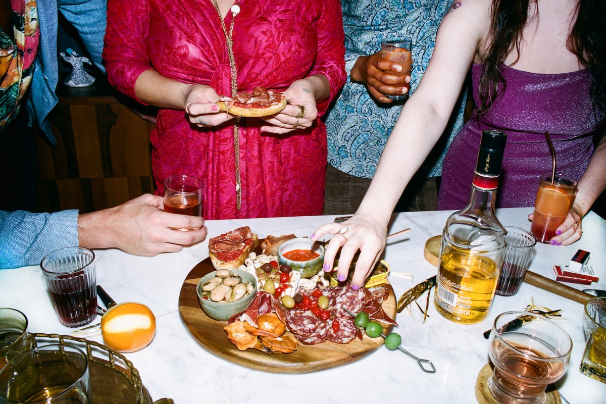 people standing around a table with cocktails eating from a charcuterie platter