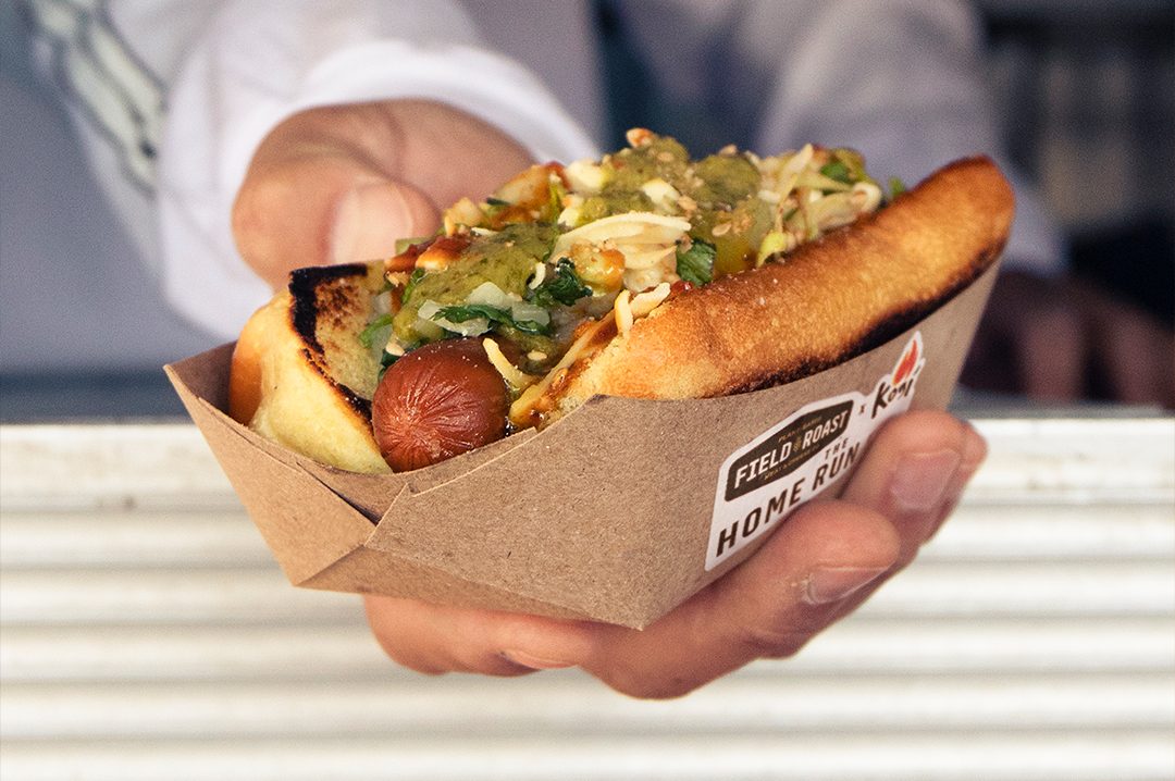 With a double-smoked and blistered Field Roast Signature Stadium Dog serving as the star, Choi’s new plant-based “Home Run” dog debuts today. It’s topped with Kogi slaw, three kinds of salsa, roasted sesame seeds, dairy-free cheese and the same relish he puts on the Kogi taco.