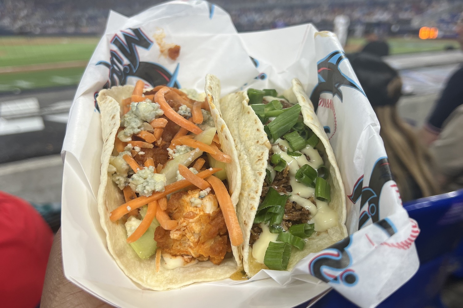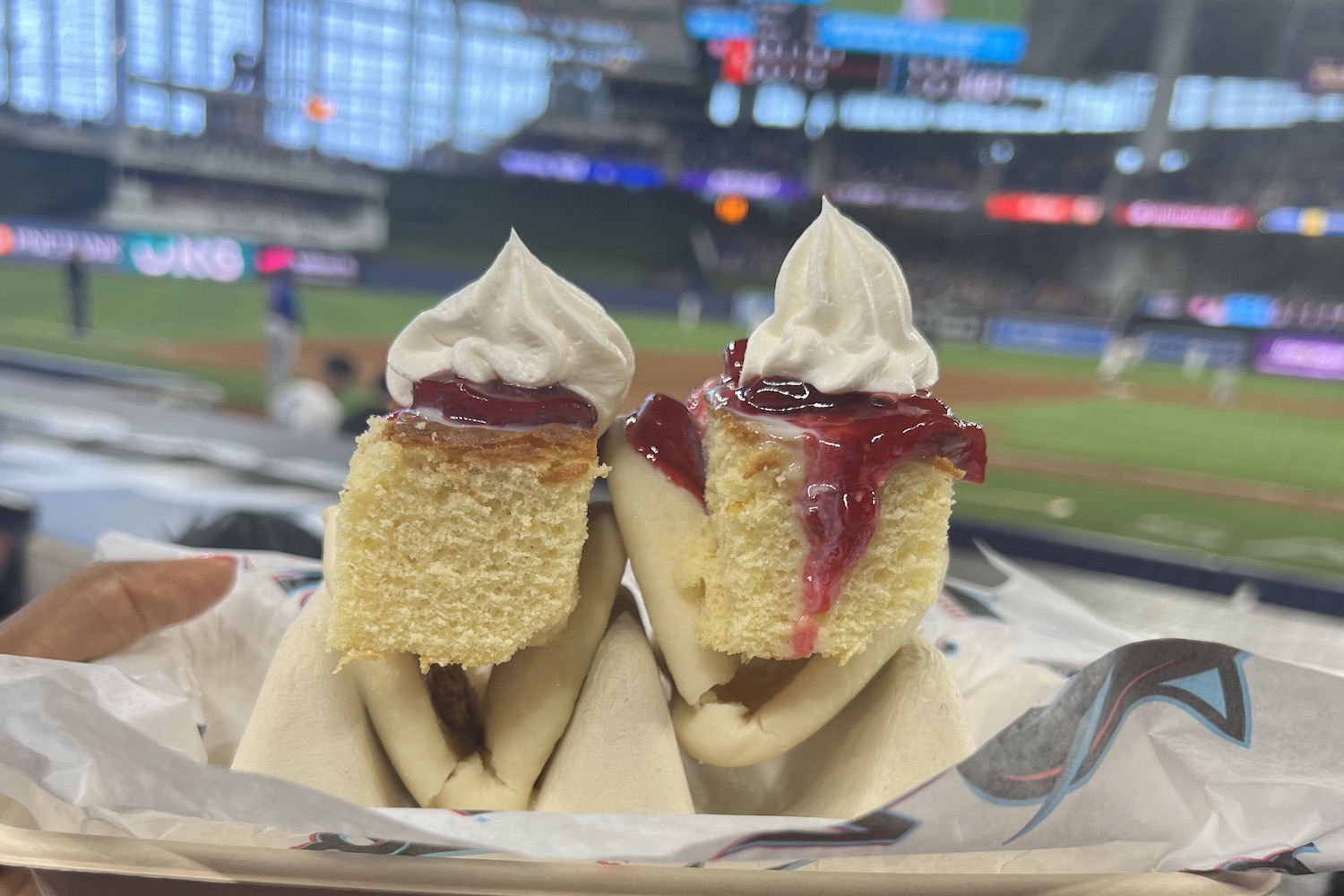 The hot dog is a classic ballpark menu item, and some purists will say that the only topping a hot dog needs is a single squeeze of mustard. I disagree. Case in point: The Goya Sazon Dog from Top Dog is a tasty Miami take on the classic hot dog, and when we sampled it, the snack was brimming with toppings and flavor. The juicy frank was nestled in a sweet brioche bun and topped with onions, pineapple and crispy potatoes, giving each bite a mix of sweet and savory flavor. Despite all the toppings, the hot dog also held together very well, even during my emphatic participation in “Take Me Out to the Ballgame” during the 7th-inning stretch.