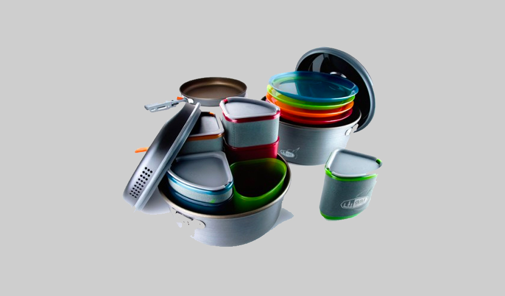 Your normal pots and pans will work for camping, but if you want to keep them clean, or you want to keep something in your camp box, I recommend getting some camp specific cookware. This set includes four plates, bowls, and mugs, plus two pots and a frying pan—everything needed to cook delish meals for four.