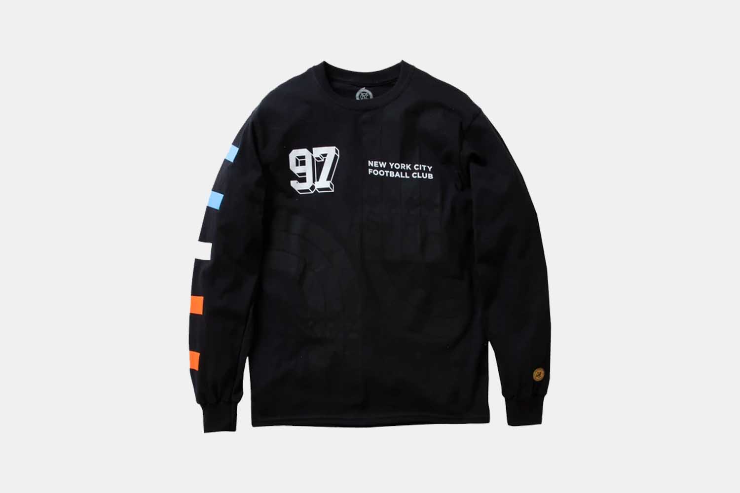 World-renowned streetwear brand Staple has partnered with New York City FC on a new capsule collection, making it the biggest streetwear apparel collaboration for Major League Soccer thus far. The five-piece collection features a white short-sleeve tee, black varsity-style long-sleeve tee, grey hoodie, dual-sided woven soccer scarf and Pintrill pin. The overal collection pays homage to the history of the NYC Subway signage vernacular, using NYCFC’s bold navy blue, sky blue and orange colors to create minimalist, geometric designs reminiscent of Massimo Vignelli’s redesigned NYC Subway Map.