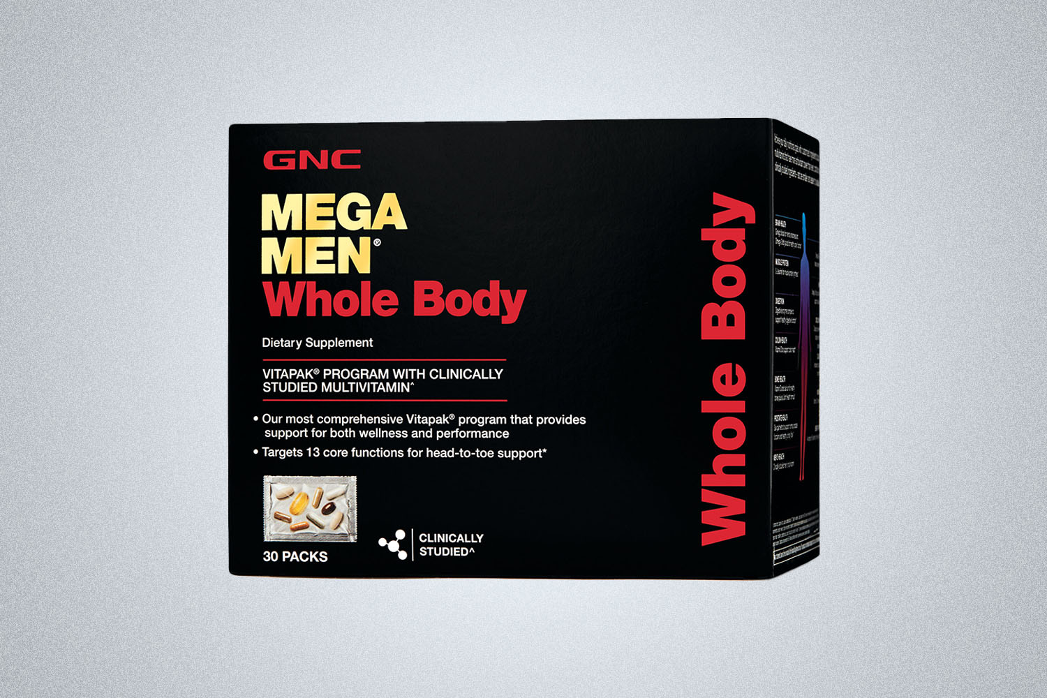 Being braulic? Pretty cool. Not so cool? Dying of vitamin deficiency. Make sure you take care of your totality — not just the delts and pecs — with GNC’s Mega Man Vitapack. Containing 30 clinically studied ingredients, individually packeted for 30 days, the VitaPack claims to “provide support for both wellness and performance”.