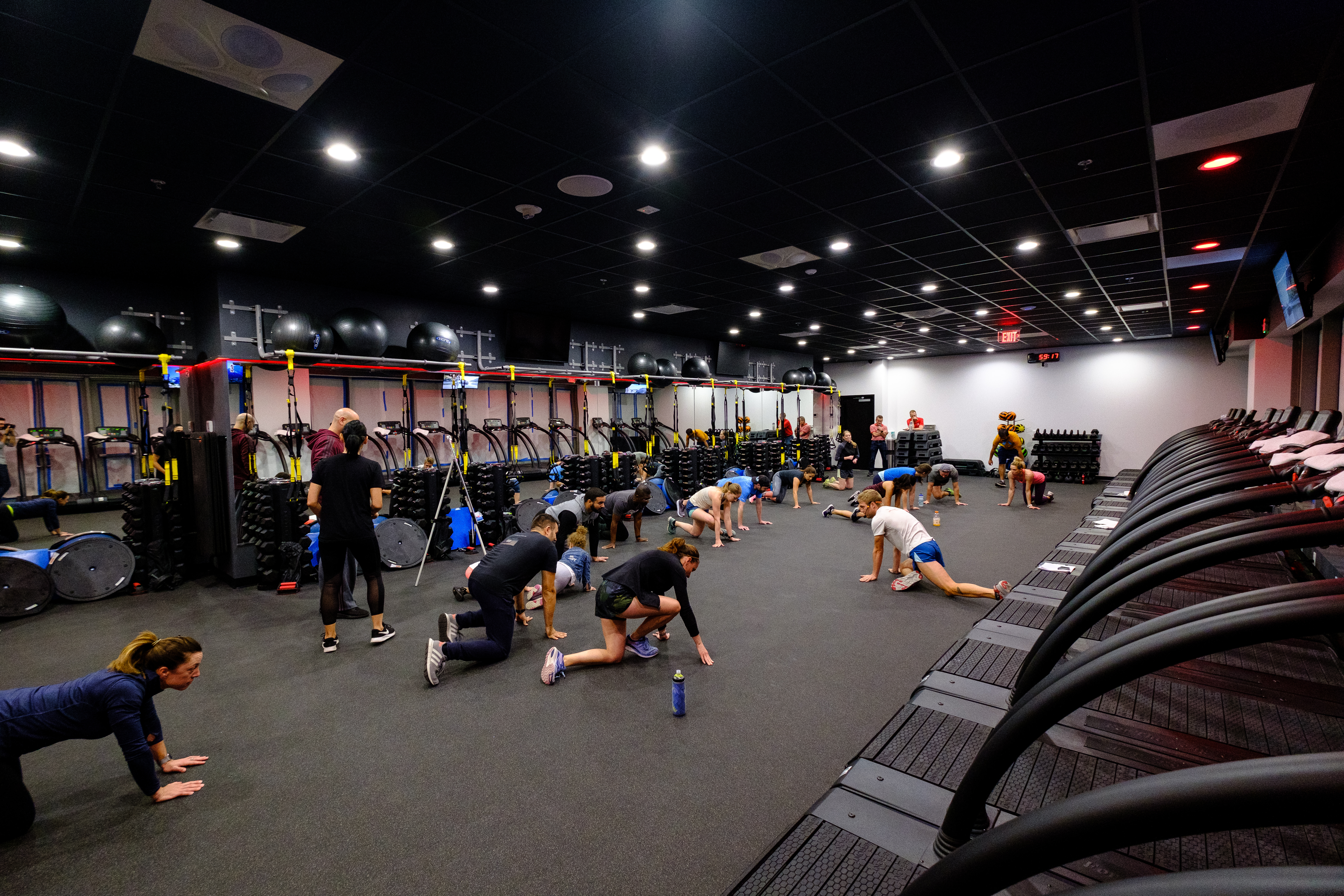 An instructor leads a post-workout stretching session at Formula Running Center