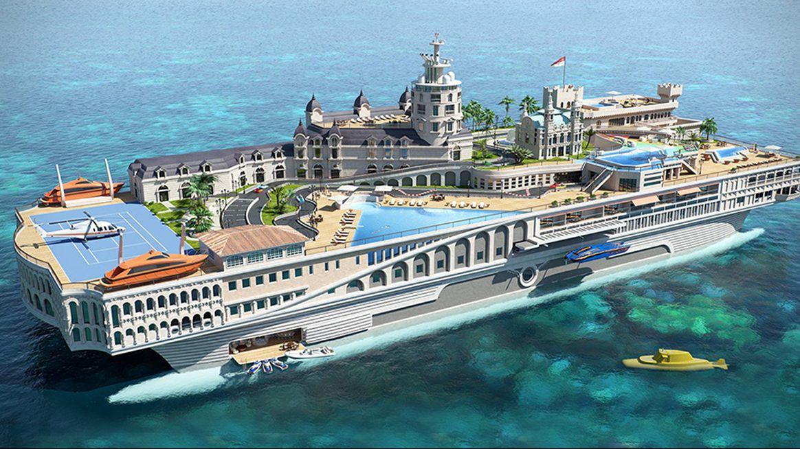 The Streets of Monaco also features multiple swimming pools; cafes; a spa; library; basketball/tennis courts, which can double as a helipad; parking spaces for smaller yachts; and even a submarine, should you grow bored with hanging out on the ocean’s surface. Featuring accommodations for 16 guests, including 3,800-square-foot VIP suites, there is also room for the staff of 70 crew members. (Hey, you need help to run Monaco.)