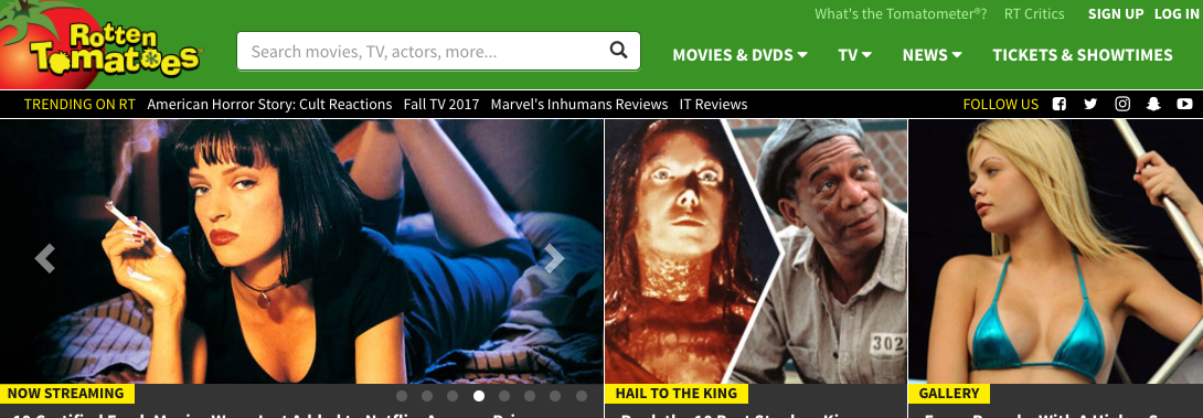 That film review aggregation site, which is owned by online movie ticket hub Fandango—which is, ironically, owned by NBCUniversal that runs Universal Pictures—compiles movie scores based on its “Tomatometer” and gives each one either a “fresh” (denoted by a ripe red tomato) or “rotten” rating (denoted by a splattered green tomato). To receive a fresh rating, the movie has to have 60 percent or better Tomatometer score, while it’s deemed rotten if 59 percent or less of the reviews are positive. There’s even a “certified fresh” rating, which denotes a sustained 75 or better Tomatometer rating. (If you’re wondering who constitutes a legitimate movie reviewer according to the site, Rotten Tomatoes has a rather involved methodology, which you can read here.)