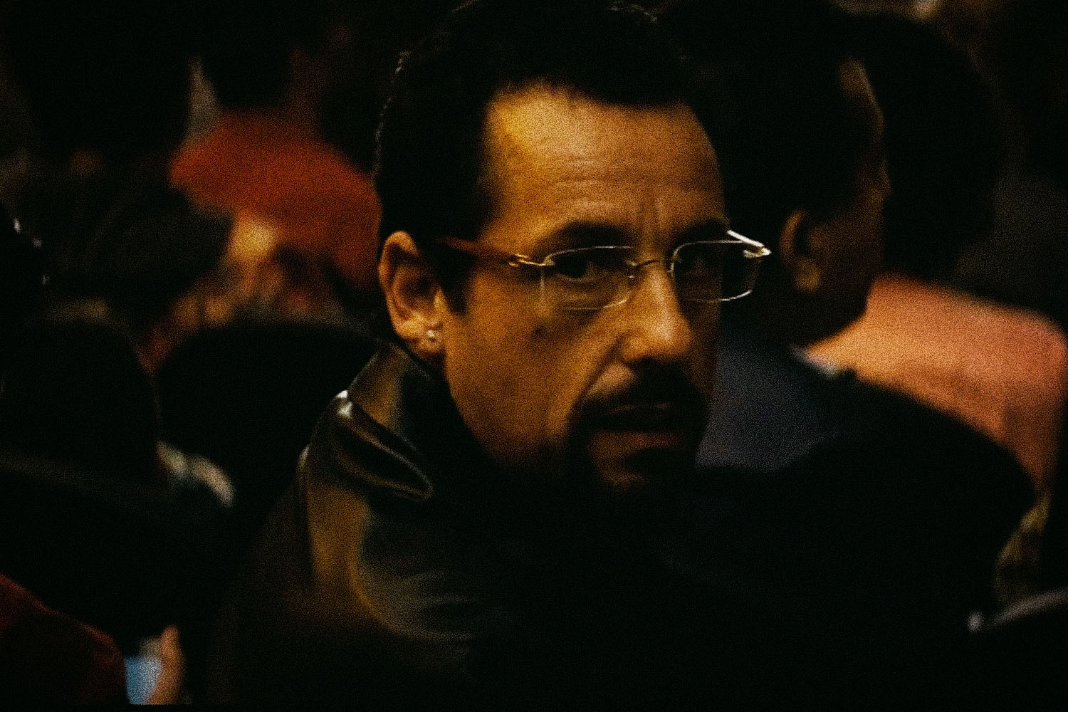 In his slightly oversized leather jacket and vibrant polos blinged out with flashy rings and diamond studs, Howie is hardly the spitting image of a family man. We see him in action at his diamond district jewelry store, fending off thuggish debt collectors and parlaying with Kevin Garnett over a rare black opal potentially worth millions, then dropping into a luxury condo he shares with his obscenely hot younger girlfriend (Julia Fox). It’s only after all this that Howie drops in on his three kids and wife (Idina Menzel), who is rightfully embittered by his flightiness and hopeless self-absorption. Earlier, we see Howie marvel at his newly-acquired opal, the promise of scoring big glimmering before his eyes as his disgruntled longtime employee goes on a tirade and ultimately quits without Howie ever noticing. His family is not exempt from such treatment. Eyes glued to a game on which he’s bet an obscene amount of money, Howie flouts his goodnight duties by watching ESPN on his phone as he lays on the floor of his son’s room involuntarily letting out hoots and groans instead of performing the expected tuck and kiss.