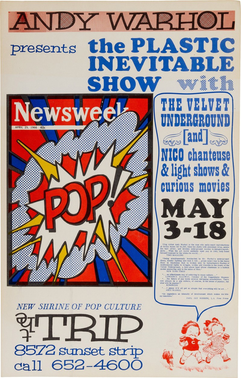 1966 – The Velvet Underground and Nico – One of the most influential East Coast bands of the ’60s, The Velvet Underground was managed by pop artist Andy Warhol, who suggested they have German singer Nico front the band. This concert poster pre-dates the band’s 1967 debut album, The Velvet Underground & Nico, which includes some of their best-known tracks: “Sunday Morning,” “I’m Waiting for the Man,” and “Venus in Furs.” The “Exploding Plastic Inevitable” was a primitive, traveling multimedia circus of sorts that Warhol brought on the road. Bid here.