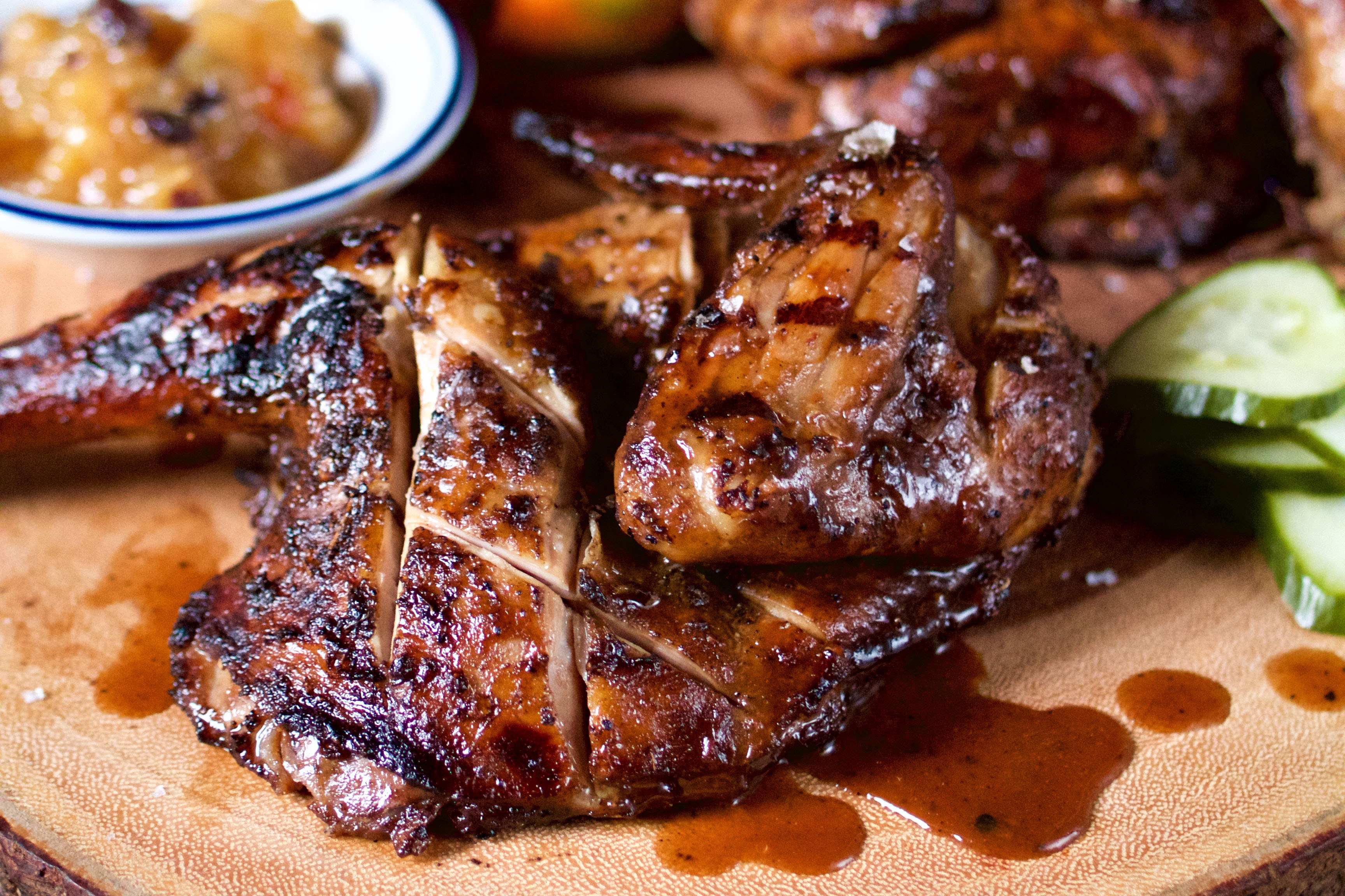 5. Flip the chicken and char the skin until desired char is achieved. Flip once again, then start to baste with jerk sauce. Keep this up for about 20 minutes.