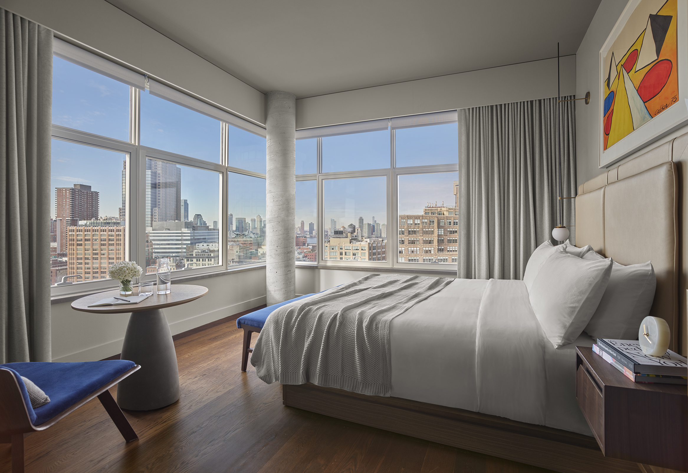 In keeping with Sitt’s vision, the rooms have been appointed with elegant, mid-century furniture, dark wood floors and bright prints from the same contemporary masters you’ll encounter on an afternoon sojourn to the MoMA or nearby Whitney. And as far as creature comforts go, all of the trappings of a luxury hotel are present, from Le Labo bath products to Frette linens to a rain-style shower I could actually stretch out in (a novel concept for anyone who’s acquainted with typical NYC hotel dimensions).