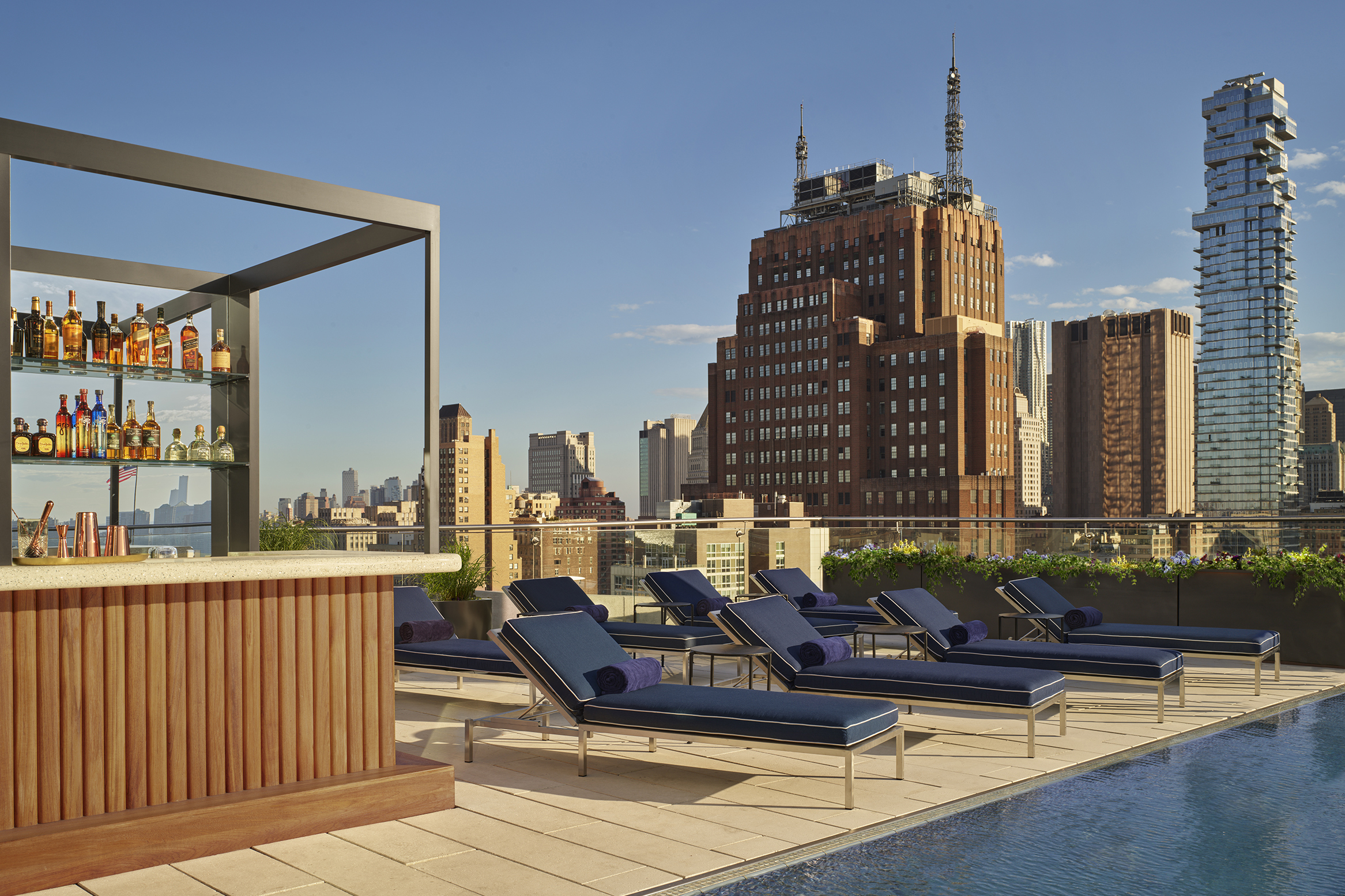 The James wasn’t in need of a gut renovation so much as a carefully calibrated rebrand. The bones of the building have always been exceptional by New York standards: the building’s prominence in a relatively low-lying corner of Manhattan makes for 180-degree views of Downtown, there’s a multi-tiered patio and terrace that formerly housed two outdoor restaurants (the Garden at David Burke Kitchen and the Gitano Jungle Room), and, of course, the enduring appeal of the bar at the top of it all. If anything, the James had sold its canvas short, positioning itself as an accessible, mid-tier hotel in a neighborhood that caters to the jet set.