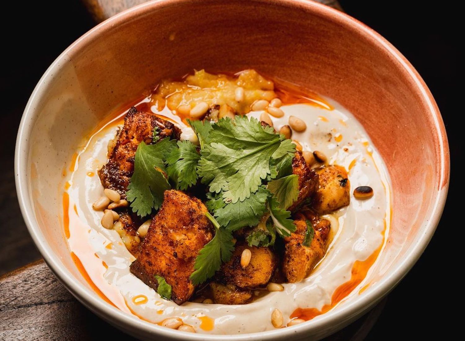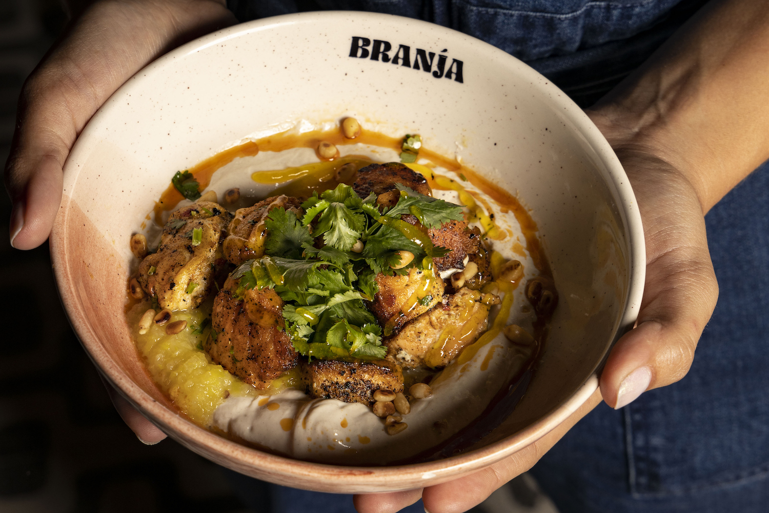 At Branja, Masterchef Israel champ chef Tom Aviv digs into his Israeli roots in crafting a delicious portemanteau of a dish: The Fishwarma emulates the flavors of shawarma with a mix of fish, spices, pine nuts and paprika oil. Served atop creamy labneh tahini and finished with a fresh mango amba syrup, it’s a bold blend of flavors that’s sure to surprise and tantalize adventurous palates.