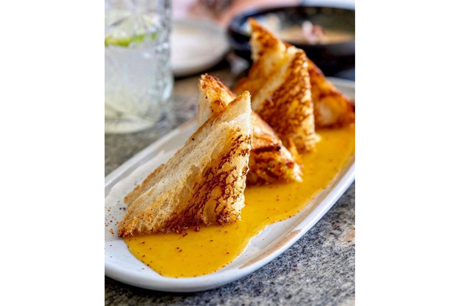 “We were thinking about a good bar snack to serve on the rooftop, but we wanted to elevate it,” he says. “The grilled cheese is decadent and simple, with a tropical twist.”