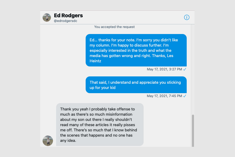 A few minutes later, my critic addressed me again, this time sending a lengthy direct message that only I could see. I almost deleted it without reading, but then the name hit me like a ton of bricks: @edrodgersdc. Ed Rodgers. Was Aaron’s — allegedly estranged — father ranting at me on social media?