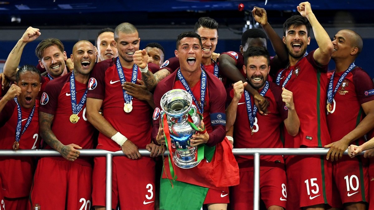 Cristiano Ronaldo of Portugal (center) lifts the European Championship trophy after his team won 1-0 against France. (Matthias Hangst/Getty Images)