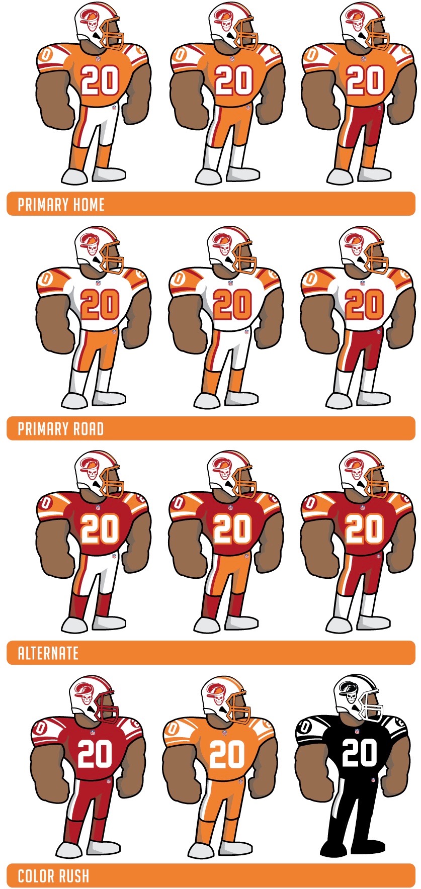 But if we’re going to redesign the Bucs, what’s the best way to go about it? Should we bring back the Creamsicle color palette, or stick with red and pewter, or even find a way to merge them? Similarly, should we exhume Bucco Bruce, maintain the Jolly Roger, merge them into a hybrid or just blow everything up and start over?