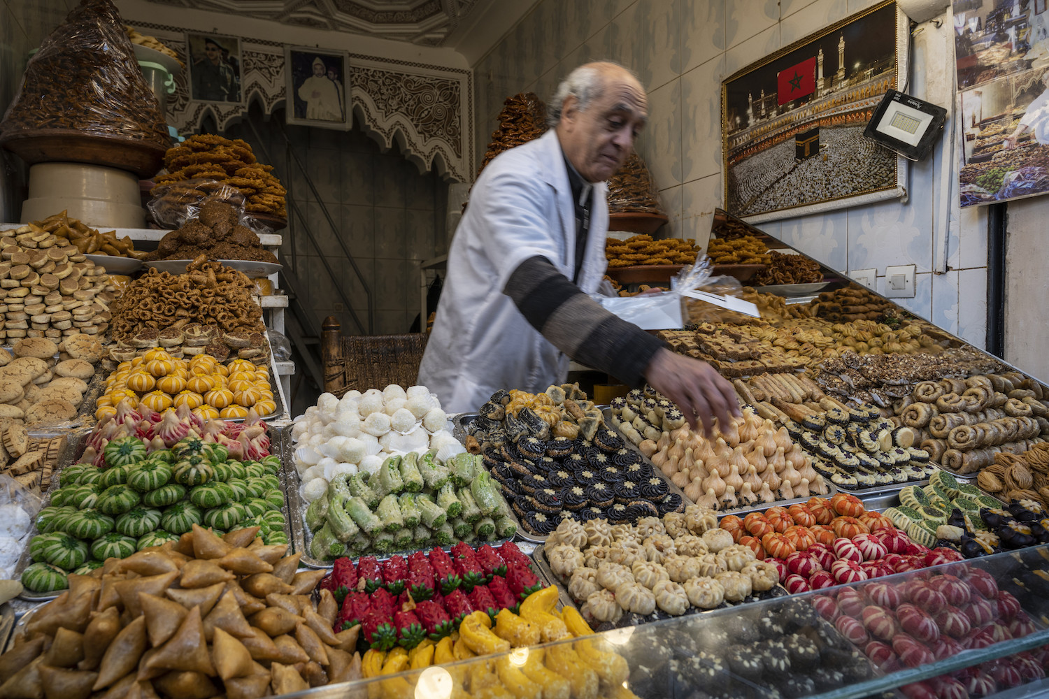 A pastry chef sells typical Moroccan sweets in The Medina