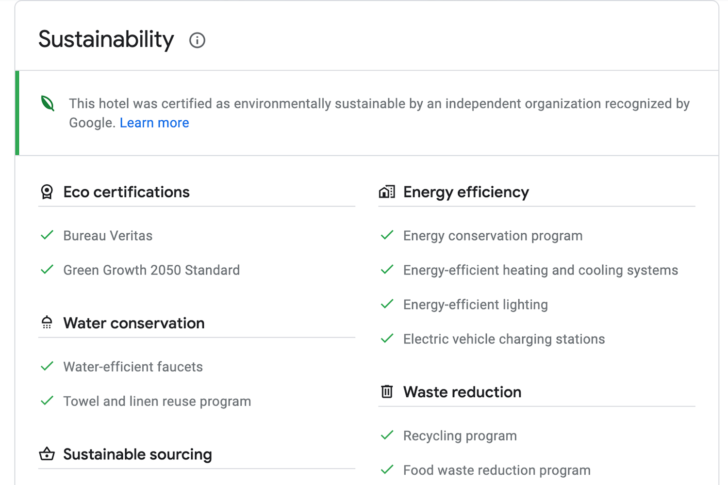 “Hotels can now identify their sustainability efforts on their hotel detail page alongside amenities and health and safety practices,” an explanation reads on the sustainability in hotels landing page. “This information only appears for hotels that opt-in to self-reporting and have sustainability practices to report.”