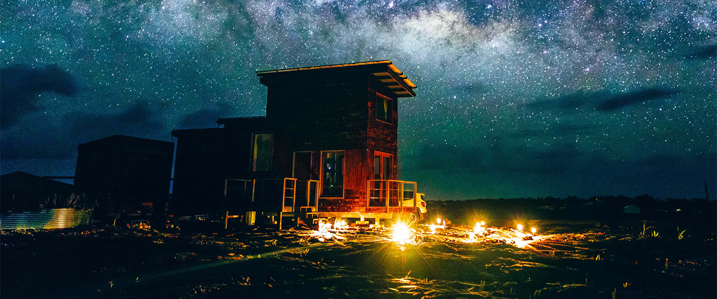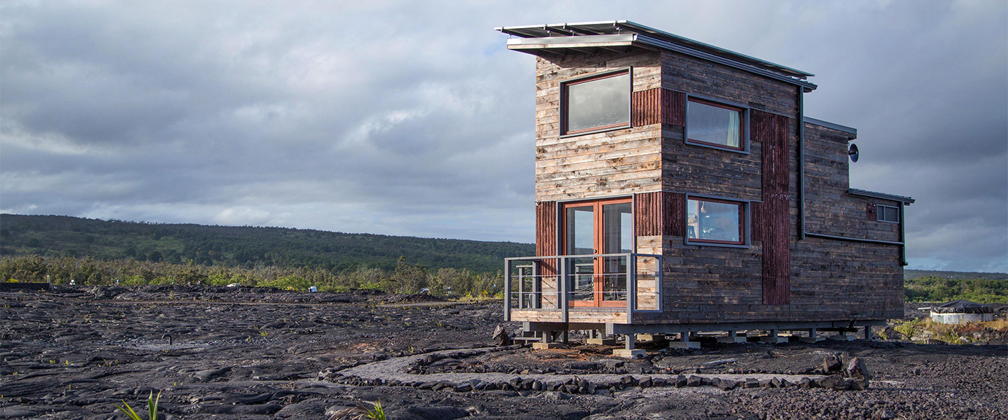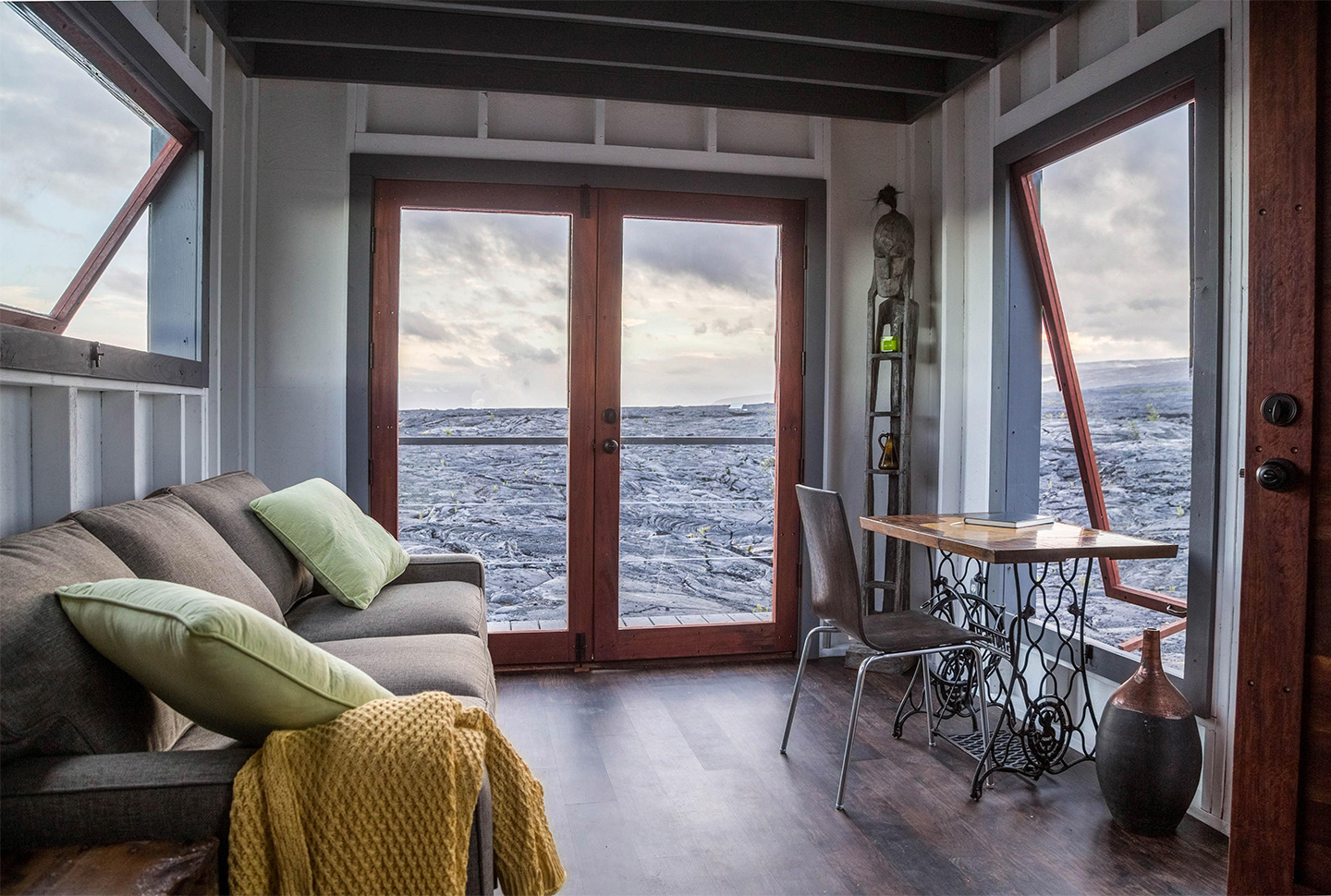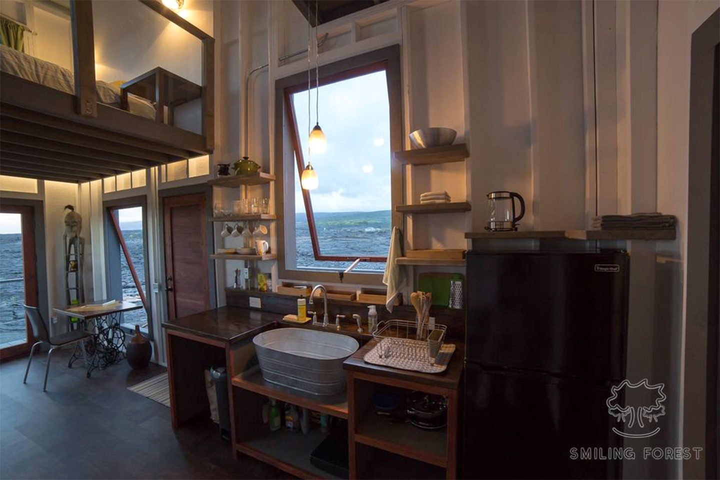 (Smiling Forest/Airbnb)Situated at the base of Mauna Loa volcano on the 1990 Kalapana lava flow, it is a short four-mile bike ride to the 100-foot waterfall of lava flowing into the ocean at one ton a minute.