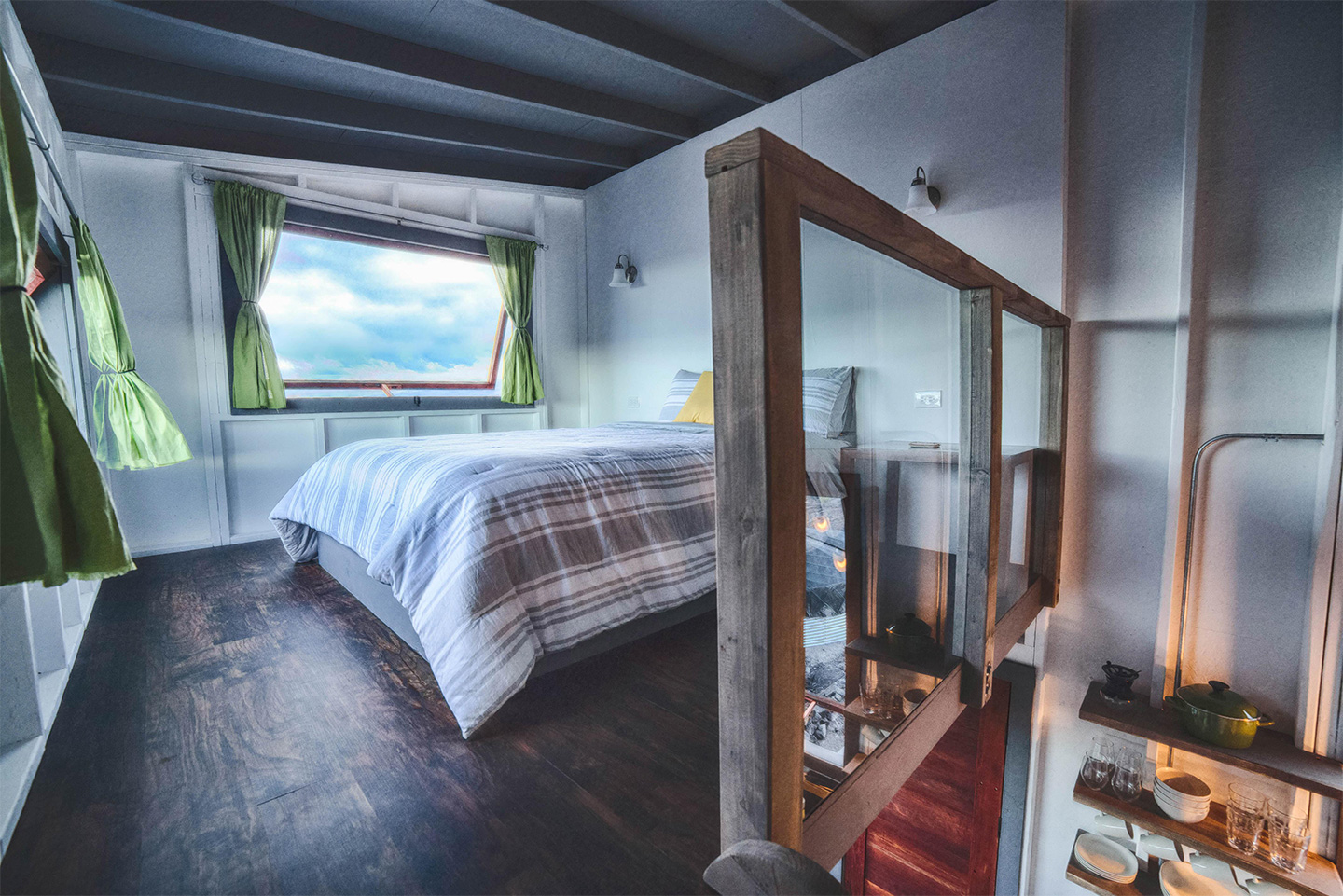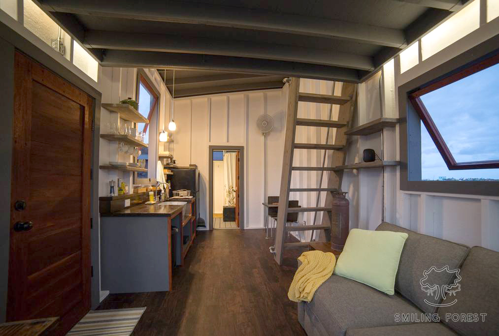 The tiny 450-square foot home listed online for about $130 a night. It uses solar power, rainwater and regenerative power to run.