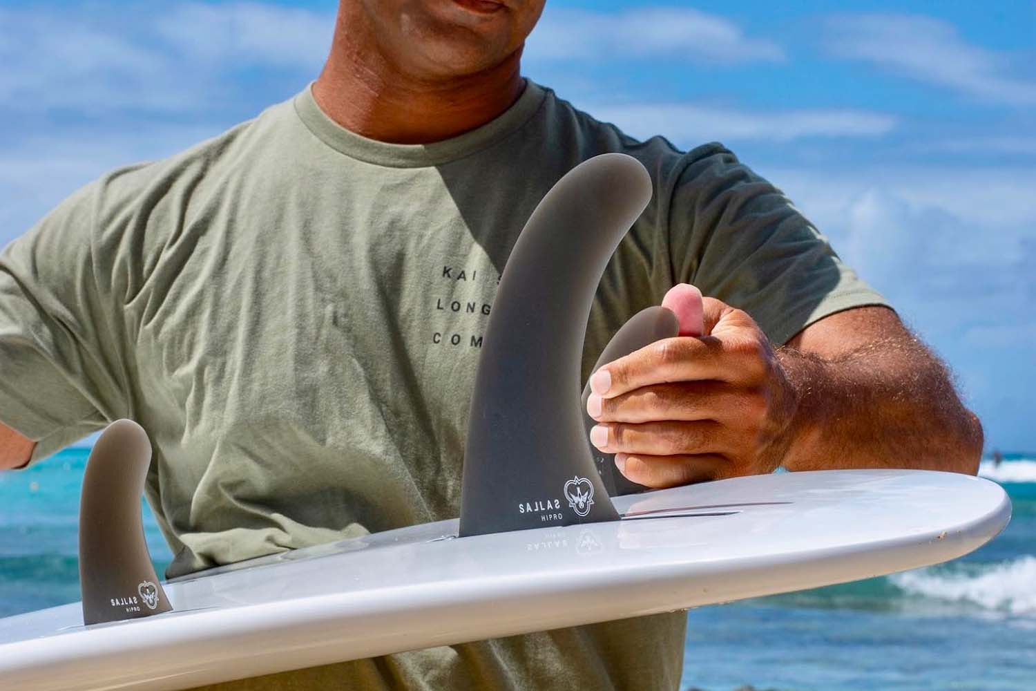 “The Mango is a more sporty, maneuverable ride for various waves. I used to surf Pipeline, which could be double or triple overhead barrels. When I started, that was the Hawaiian style of longboarding, and for many years I’d drive up to the North Shore and surf Pipeline or Sunset on my 9-foot performance longboard. Nowadays, it’s a bit more relaxed, and I’m more of a single fin nose rider.” Made with a “slow-rolling Waikiki-style wave” in mind, Sallas’ single fin set up is all about “smooth rides and everything a traditional longboard should be.”