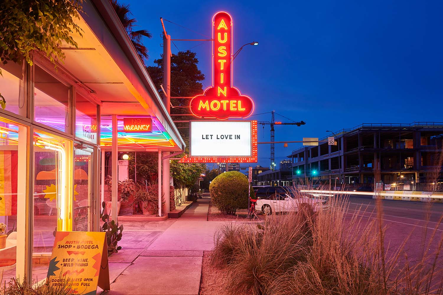 Operating since 1938 and a beloved part of Austin’s history, this motel is a step back in time at one of the most iconic hideouts on South Congress. Bunkhouse Hotels renovated its 41 rooms in their signature style, with custom vinyl tufted beds, boldly designed wallpaper, classic push-button phones, and vintage music posters, but stayed true to the building’s mid-century roots preserving the original neon sign and kidney shaped pool. Order a Mermaid Mojito or Lemonade Lounger from The Pool Bar and mingle with fellow motel guests and Austin locals at the adults-only seasonal Neon Night Swims. There’s a Bodega in the lobby for snacks, drinks and souvenirs, plus the Bat Bridge, shops and nightlife venues along South Congress all within a walking proximity.