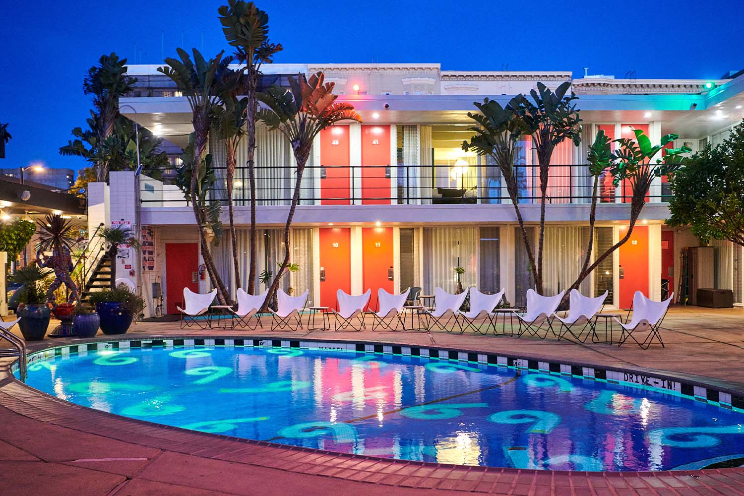 Opened in 1956 as the Caravan Lodge, this Tenderloin district motor retreat became a go-to for touring bands after being rebranded the Phoenix in 1987 — mainly because its car park could accommodate their buses. Everyone from David Bowie, Debbie Harry and Nirvana to the Red Hot Chili Peppers stayed — and partied — there. Hospitality group Bunkhouse took over in 2018, kept the original 1950s architecture and remained faithful to the hotel’s rock n roll history, updating the rooms and suites with vintage concert posters and neon lights. The landmarked swimming pool (one of only two in the country) serves as a snapshot-ready focal point and social hub of the palm-fringed courtyard, while an impressive collection of 7,000 used LPs line the walls of Chambers Eat + Drink, the hotel’s adjacent lounge and restaurant, which caters to a lively brunch crowd on weekends but also serves as a moody midweek drinking den.