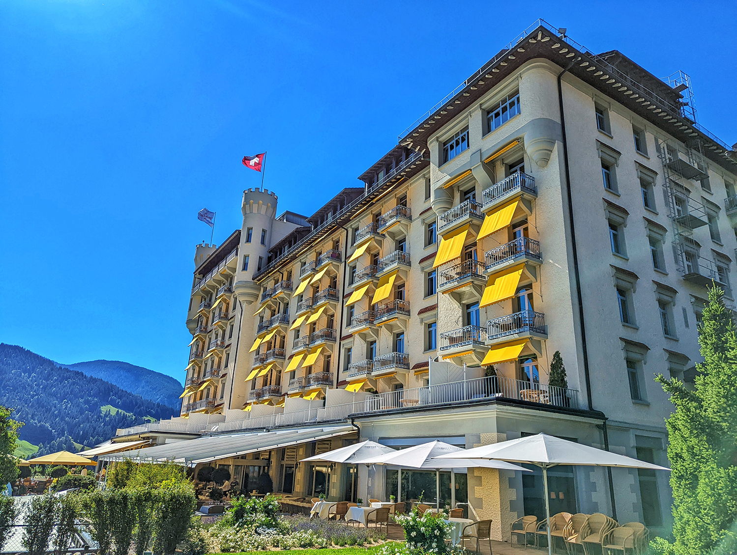 Gstaad Palace in Switzerland on a bright blue summer day
