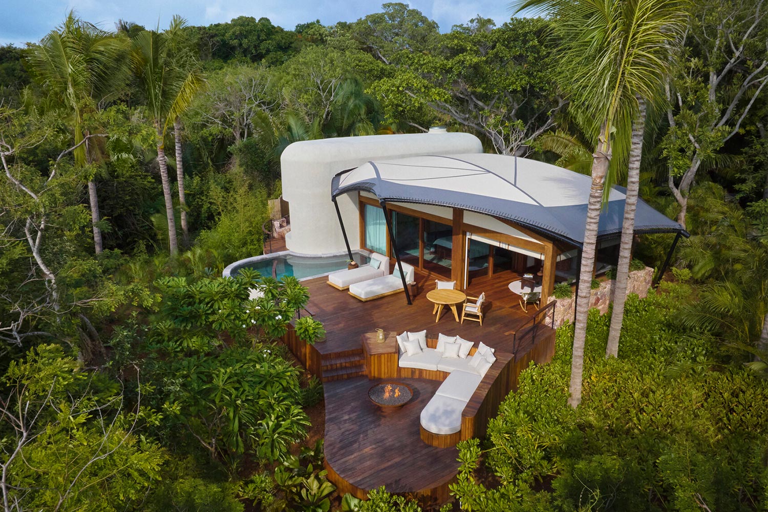 Open since December, Naviva, a Four Seasons Resort, is the newest hotel in Punta Mita. It’s an adults-only sanctuary comprising 15 luxury tents spread across 48 acres of ocean-facing forest. The tents are integrated into the surrounding nature, with open-air living rooms, private plunge pools and large outdoor living areas sporting hammocks, firepits and outdoor showers. The resort leans into local heritage and features custom furniture and artwork from Mexican craftspeople and artists, and the on-site restaurant, Copal Cocina, cooks fresh seafood and meats sourced from local purveyors. They also take wellness seriously here, with nature trails and an open-air gym. The spa facilities are tucked into the forest and include cocoon-like treatment pods and a traditional temazcal, aka a sweat lodge.