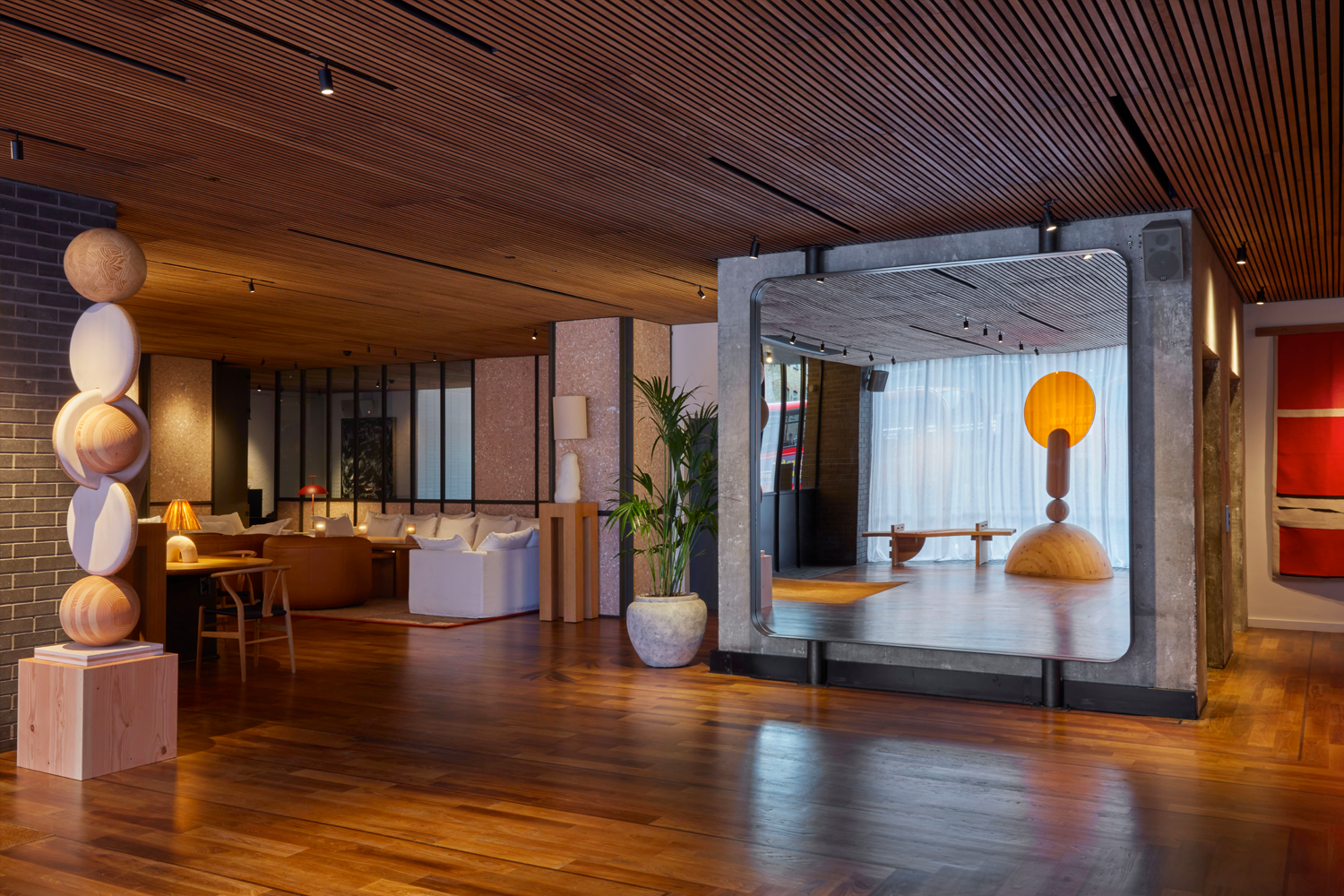 And if you tire of working (or lounging) in your room? There are a number of public spaces from which to set up shop. The lobby, in particular, is almost always alive with laptop-wielding locals and hotel guests. In addition to the resident Jan Hendzel sculptural pieces, all made exclusively from local wood, the lobby is also home to a number of smaller, cozy enclaves with their own host of carefully curated furniture — a mix of bespoke and vintage — and one giant table that serves as a communal workspace.