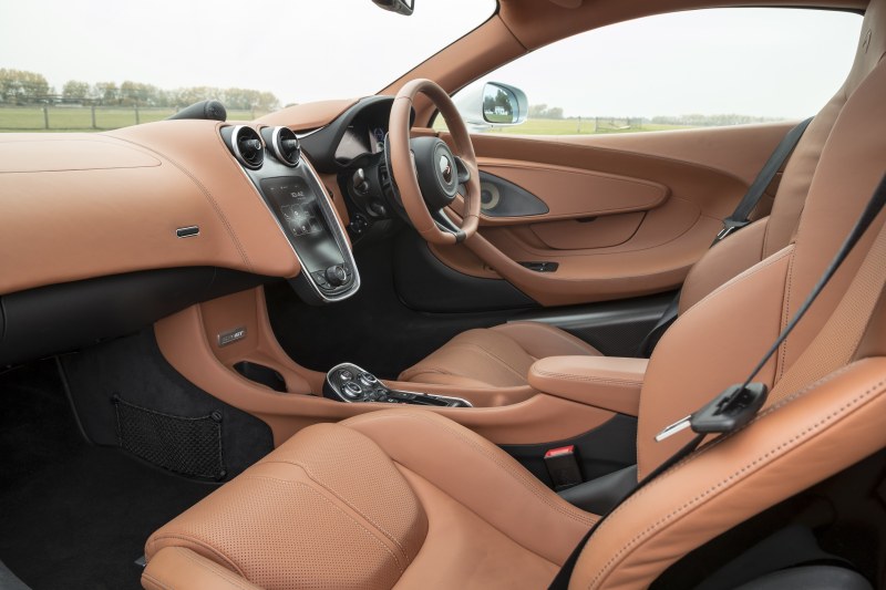 Engine: The transmission and power plant settings feature three selectable modes: Normal, Sport, and Track. And true to the GT, or grand touring, nature of the car’s moniker, the Normal settings evidence a somewhat more civilized, comfortable performance nature, working with the car’s softer suspension to absorb the bump and grind of city and highway driving. Similarly, while most exotics sputter and protest a bit in start-and-stop congestion, the 570GT’s burly 562hp twin-turbo V8 was smooth and decidedly not finicky in traffic. But it is “grand touring” with a decidedly McLaren flavor: Out on the open road and in Sport mode, there is a track-inspired and welcome nose-heavy feel to the handling (owing to the car’s mid-engine design), improving nimbleness and precision as a quick toe stab and paddle shift drop-click on the 7-speed dual-clutch transmission delivers instant access to the unbridled power of the 32-valve engine. Power availability throughout the gear range is uncanny; even if you make a gearing mistake, the car is forgiving. Braking is decisive, solid and not skittish; again, in a welcome nod to track readiness, you’ll need to mash a bit to stop, and that’s a good thing. The 570GT is a superhero on the highway, and on the track, a demi-god: 0 to 60mph in 2.8 seconds, 0 to 100mph in 6.1 seconds, with a top speed of 204mph with the proper settings in place.