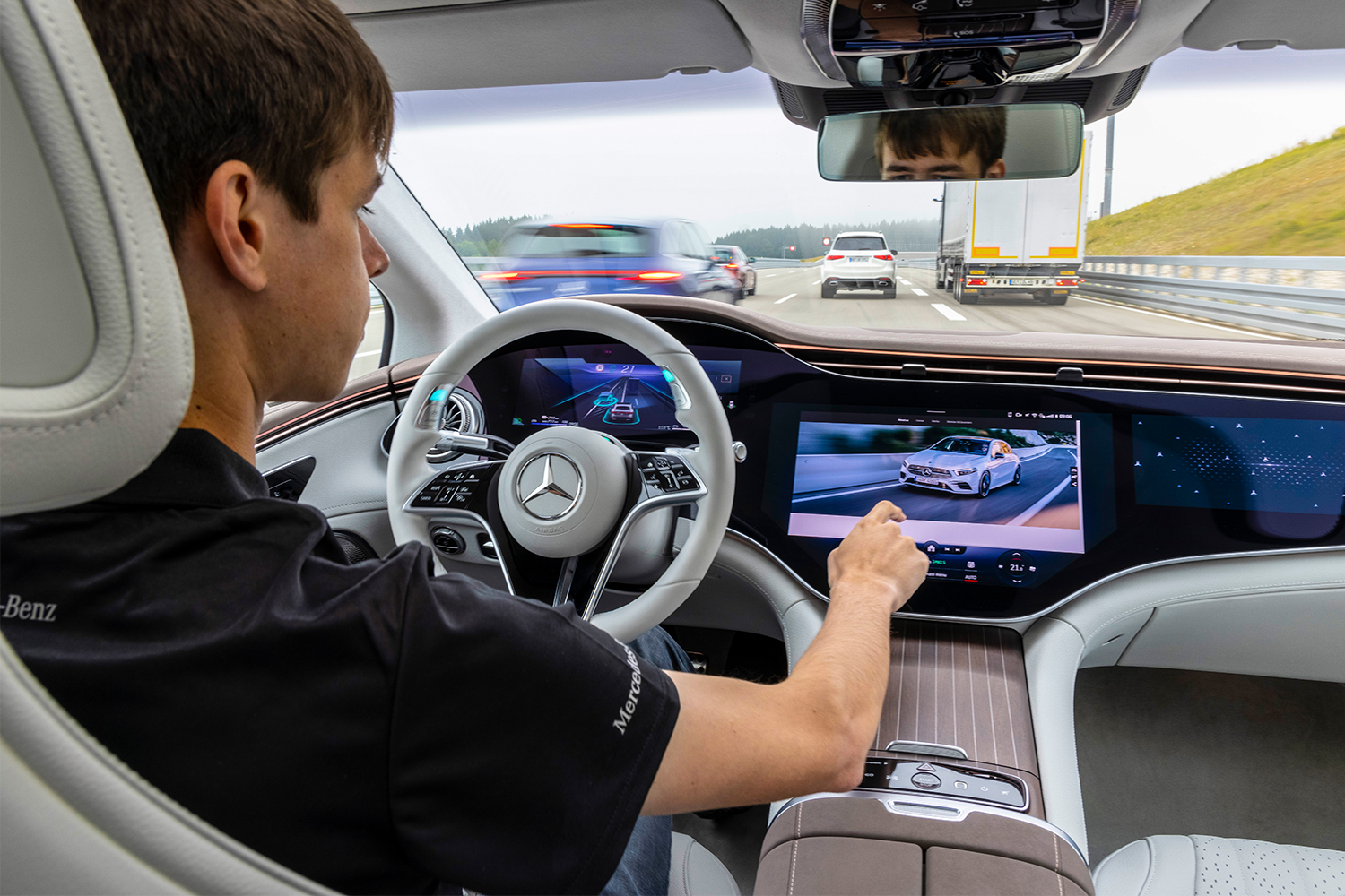 Aside from a lack of headroom at the rear, the sedan’s interior feels airy and bright, a function of its dual sunroof setup, pushed-out door panels and the intense number of light sources arrayed throughout. This includes not just the color-controllable LED ribbons that frame nearly every significant shape inside the car, but also the enormous MBUX “Hyperscreen” that dominates its front.