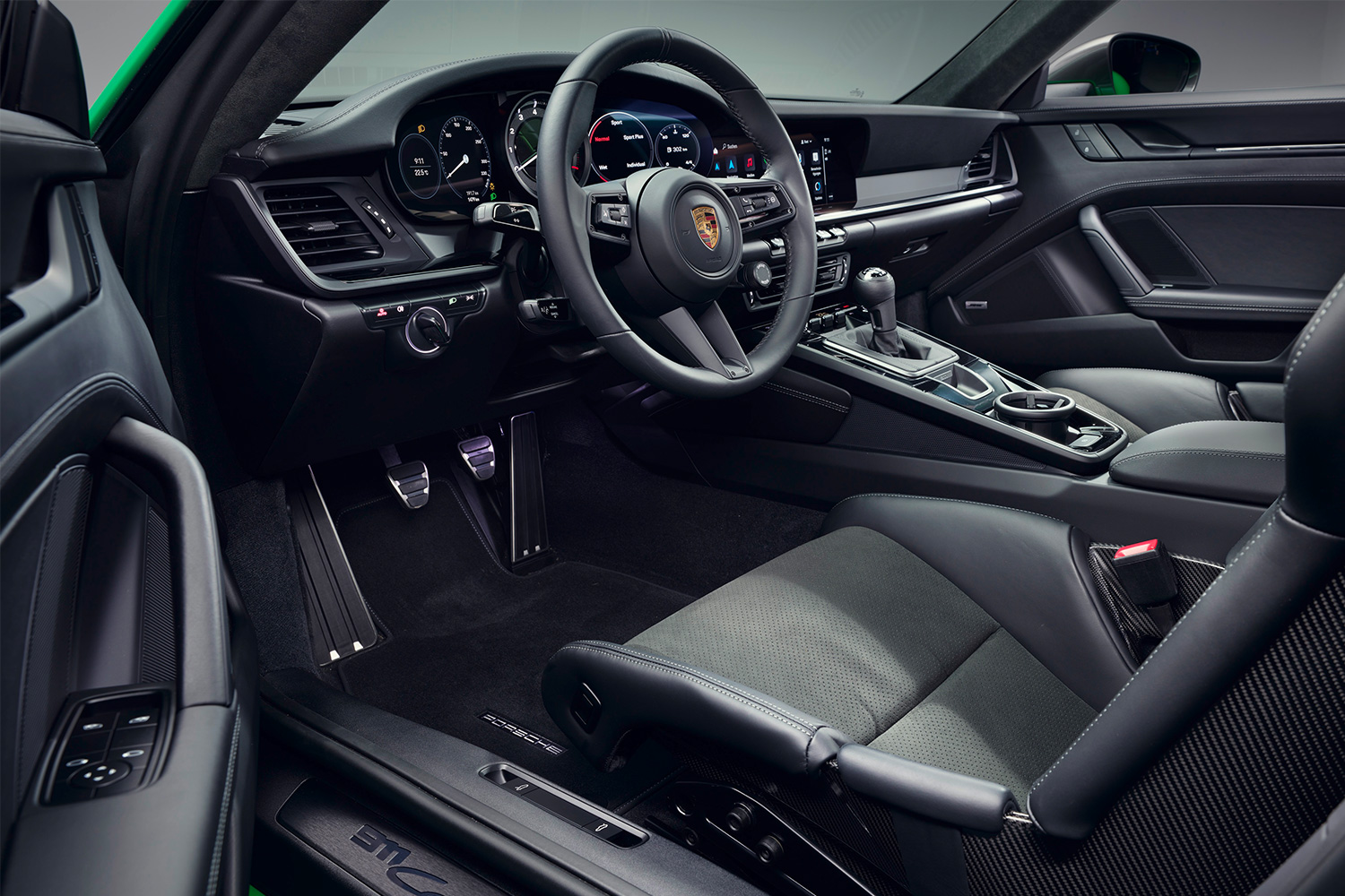 Here the formula starts with a standard 911 Carrera and its 379-hp, twin-turbocharged 3.0-liter flat-six engine, but things quickly deviate from the norm. While the base car is only available with an eight-speed PDK automatic transmission, a seven-speed manual gearbox is standard equipment for the Carrera T. A torque-vectoring limited-slip rear differential is also part of the deal, as is Porsche’s PASM active suspension system with sport-tuned dampers and springs that lower the car by 10mm – a suspension package which is also not available on the base Carrera. A staggered set of wheels and summer tires (20-inch wheels with 245mm-wide tires up front, 21-inch wheels with 305mm tires in the rear), an active sport exhaust system, the Sport Chrono Package, and agate gray exterior trim are included as well, while rear-axle steering is optionally available.