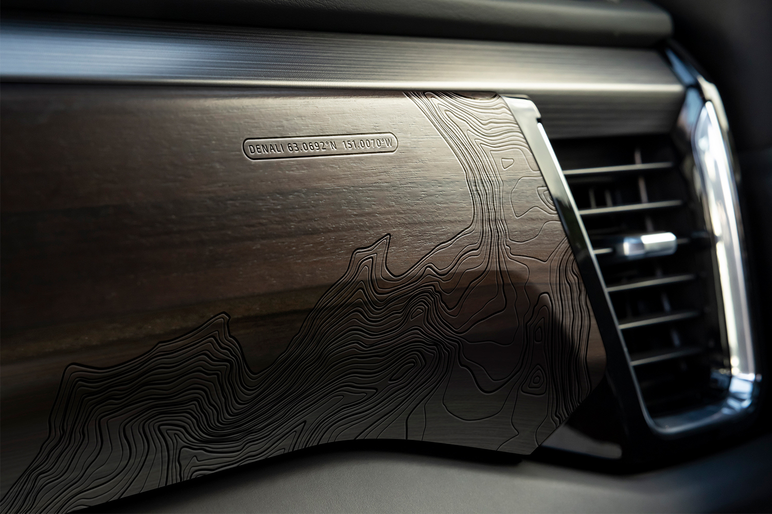 That figure represents a nearly $25,000 budget boost for the Denali Ultimate over the previous Denali (which carries on at around $65,000). Without getting too lost in the weeds of why customers are willing to pay import pricing for luxury-laden pickups, it’s easy to pick out the details that make the Ultimate worthy of its new window sticker. Those lines etched into the dash wood and seatbacks? Those are the topographical lines associated with its namesake peak, whose coordinates are also spelled out to make it easier to program into the nav. You’ll see the same wavy peaks and valleys cut into the Ultimate’s exterior badge as well, where they’re matched with a toothier grille and LED lighting that gives the truck a more appealing character than before.