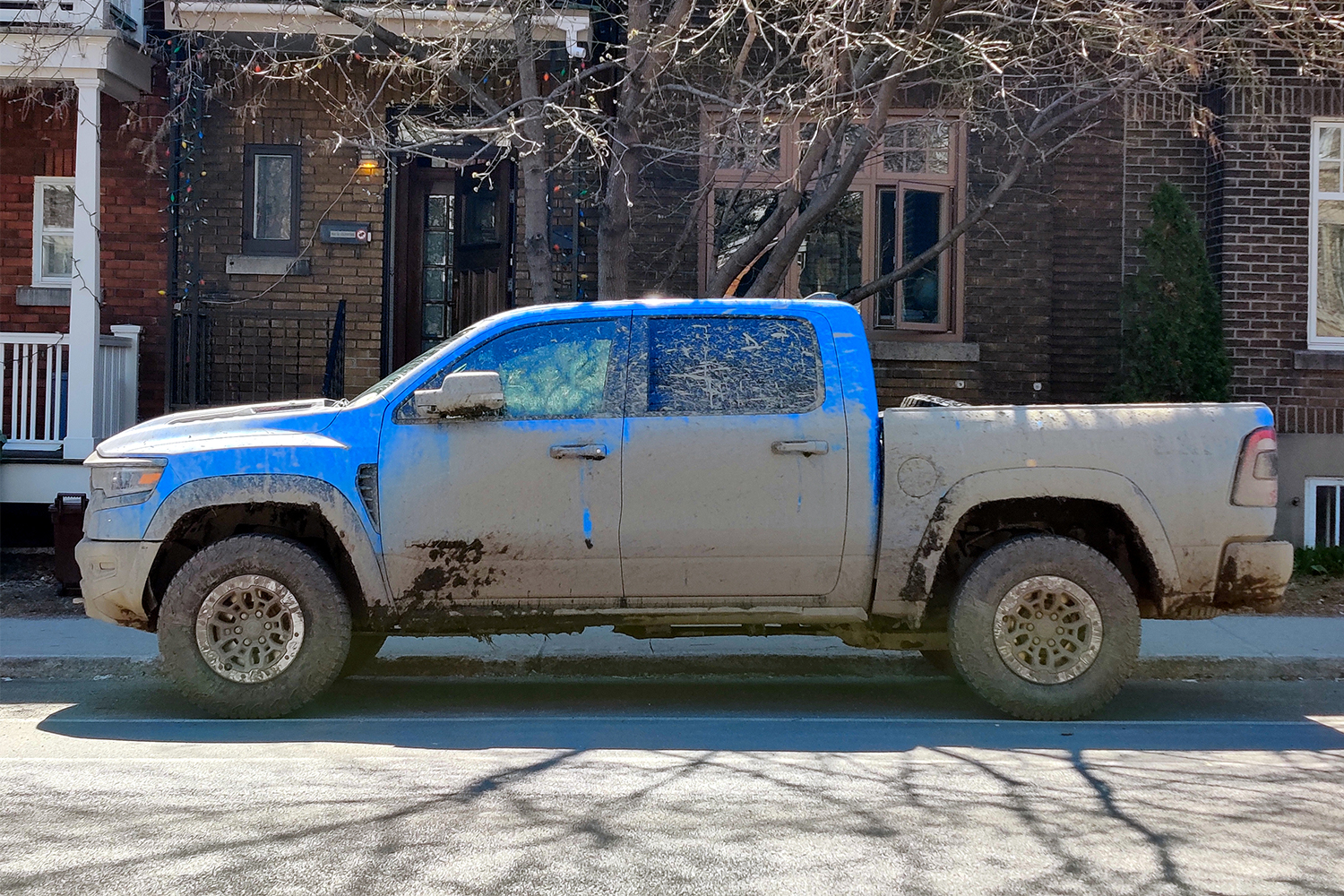 If you somehow miss the black plastic R-A-M grille crowding your rearview mirror, the sound of thunder that accompanies it at full gallop is sure to turn your head. Rated at 702 horsepower and 650 lb-ft of torque, its 6.2-liter V8 evinces supercharger whine even at part throttle, and features an ominous rumble that deepens to a roar should the driver’s right foot dip further. The TRX is a veritable storm for the senses in almost any environment, but its overall effect catapults to Category 5 in an urban environment as it looms like Lord Humongous over lesser (read: all other) vehicles on the road.