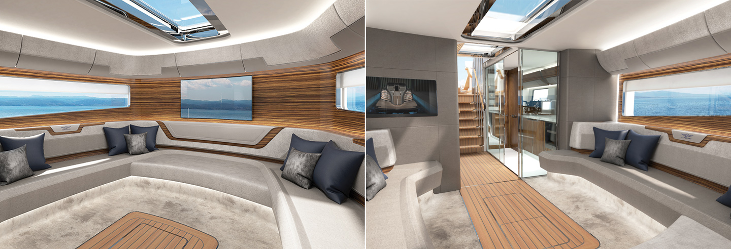Hidden below deck is a cabin that’s packed with amenities. The lounge serves as an entertainment space during the day and converts to a double suite at night. The galley is equipped with a kitchen area that boasts a fridge, coffee machine and the option of a fresh water maker. It also features a shower room and garage big enough to fit a 12-ft vessel or two jet skis.