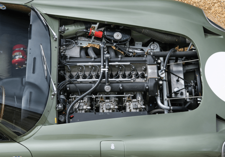 Powered by a four-liter version of the six-cylinder twin plug engine Aston Martin used in the DP212 model which competed at Le Mans in 1962, DP215’s steel box-frame chassis had to be modified in order to accommodate engine No. 400/215/01.