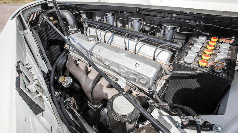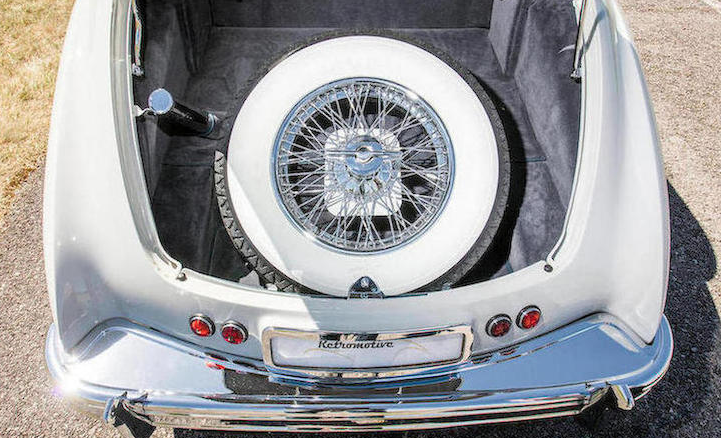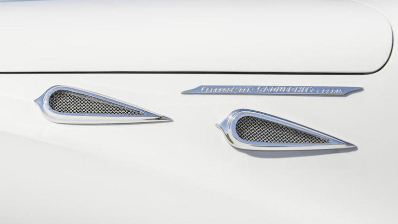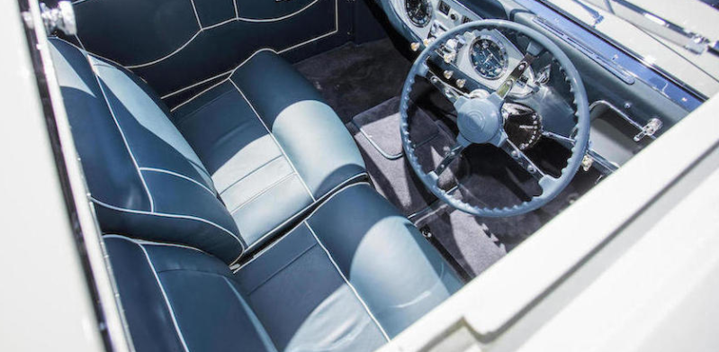 Riding on chromed 18-inch wire wheels mounted with wide whitewall tires, the car was originally decked out in light grey with some dark blue work along the underbody and the windowsills to provide contrast and enhance the car’s curves.