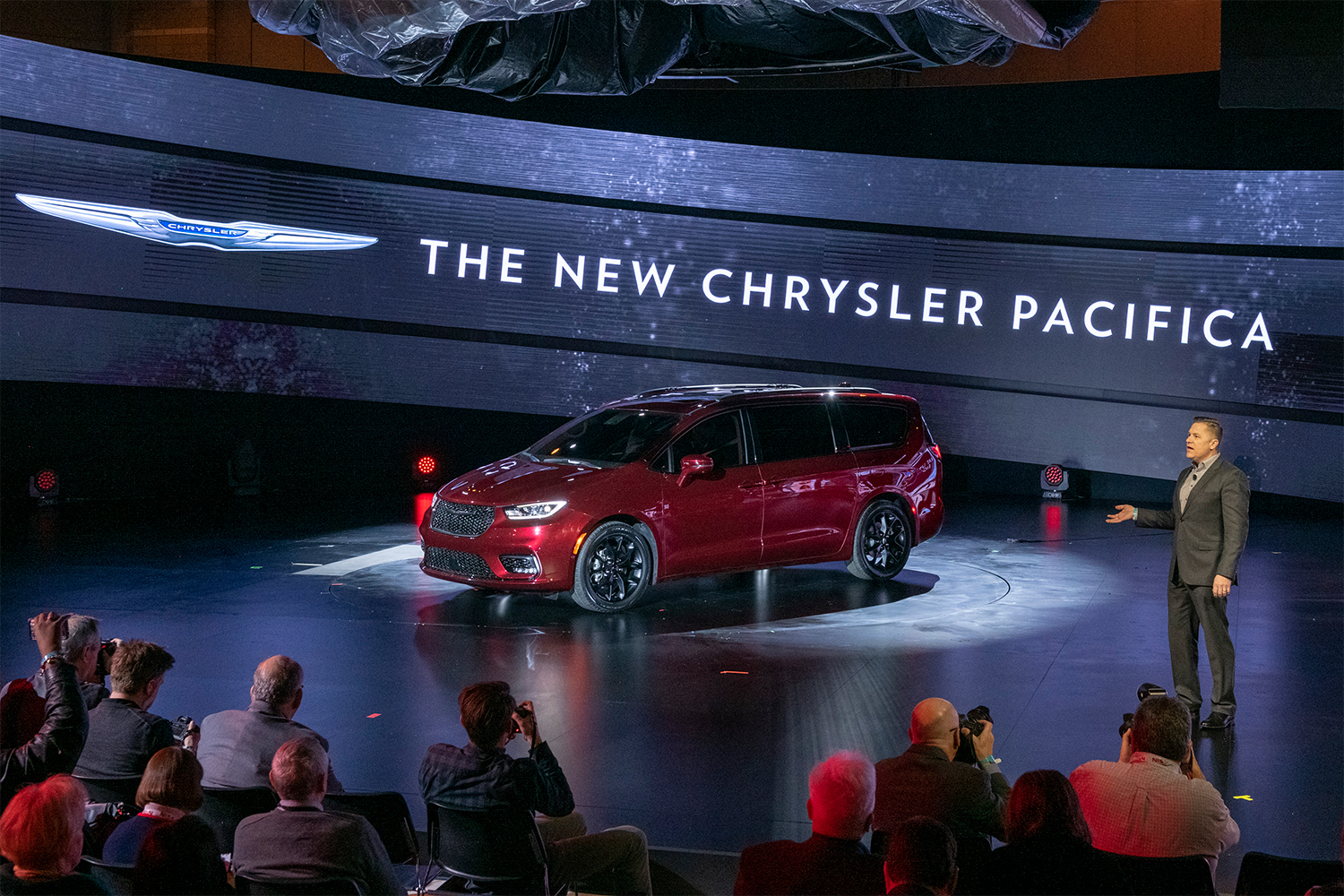 The new Chrysler Pacifica minivan in red debuting at the Chicago Auto Show. Could it be turned into an EV?