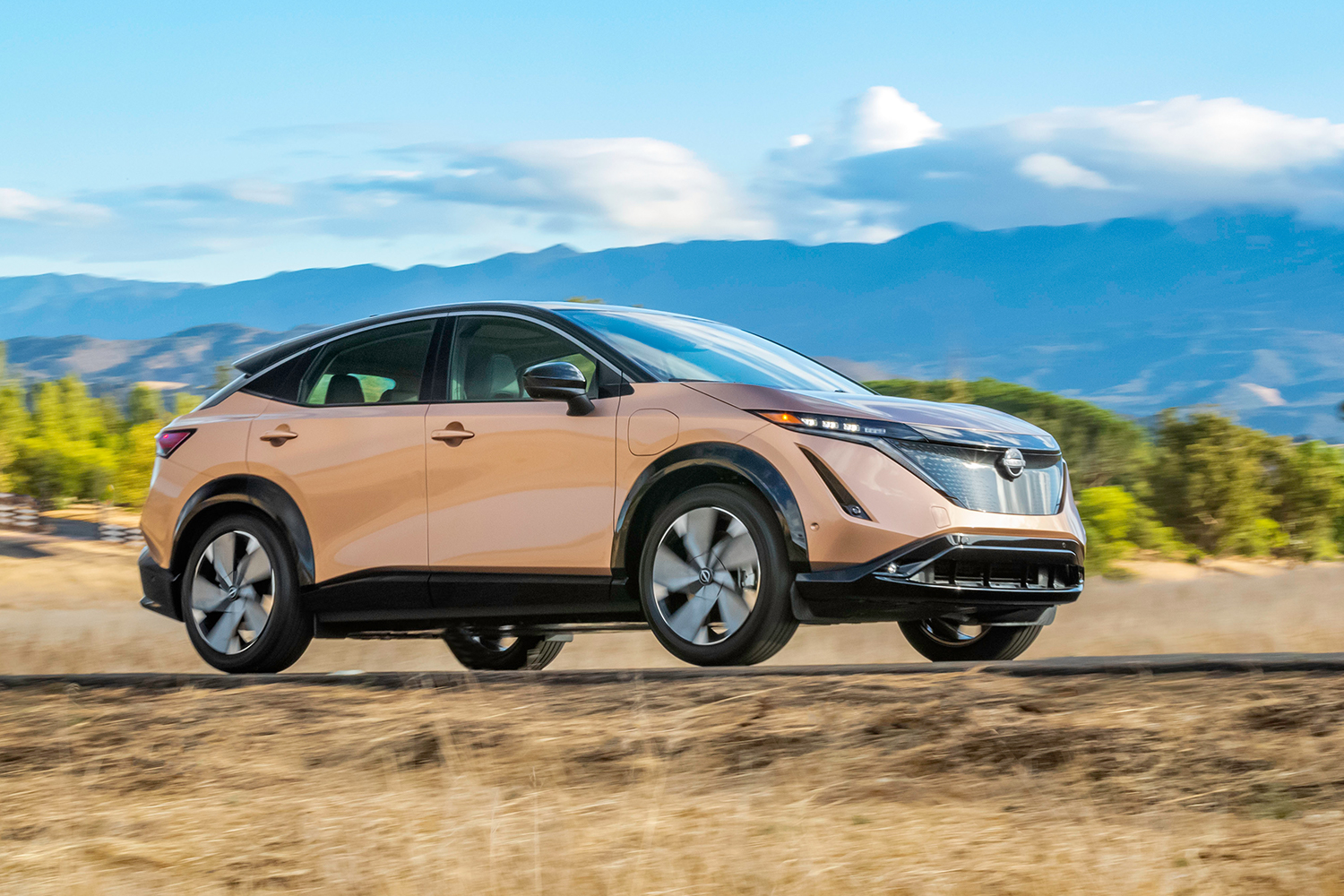 The new electric crossover from Nissan, the Ariya, driving in the sunlight with mountains in the background