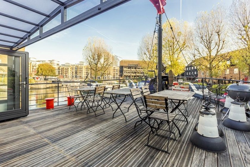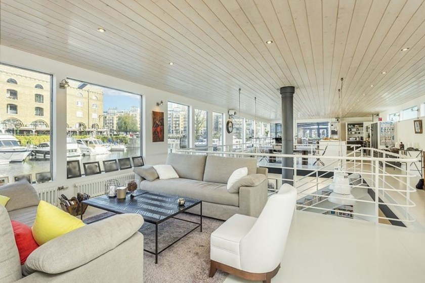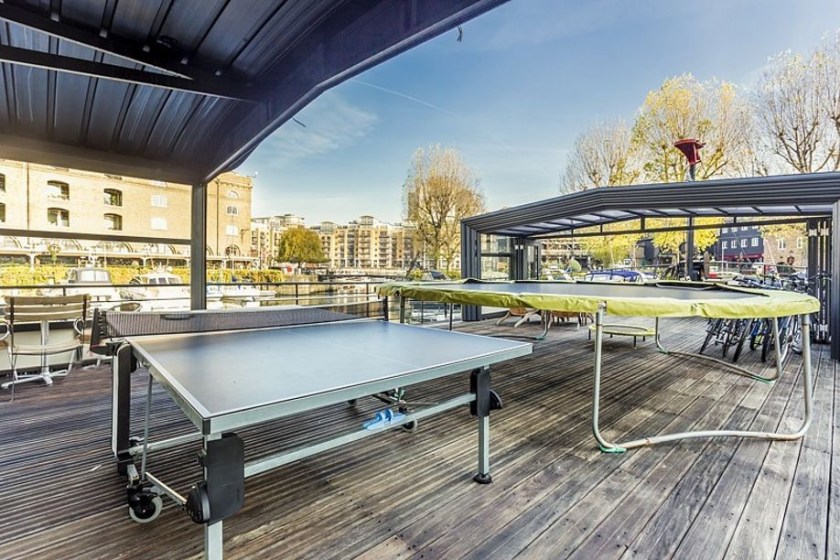 The Matrix boasts a spacious upper deck that’s perfect for sunbathing, hosting parties, or launching the jet ski from its attached platform. For potential buyers with a family, the boat also includes an indoor foosball table, outdoor ping pong table, and trampoline. Now moored in the high-end marina St. Katherine Docks, the houseboat is located near landmarks such as the Tower of London and the London Bridge.