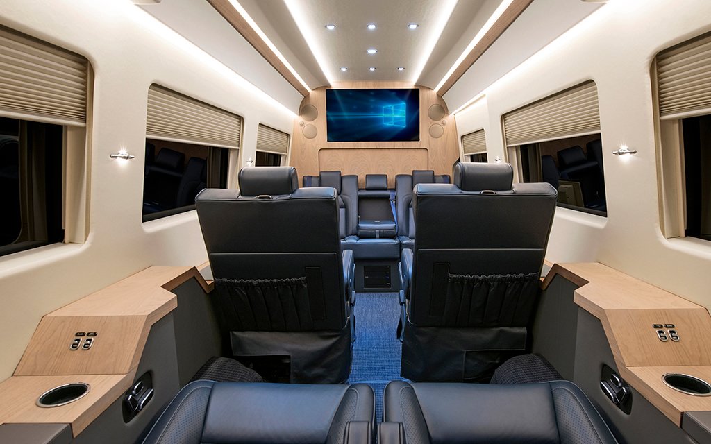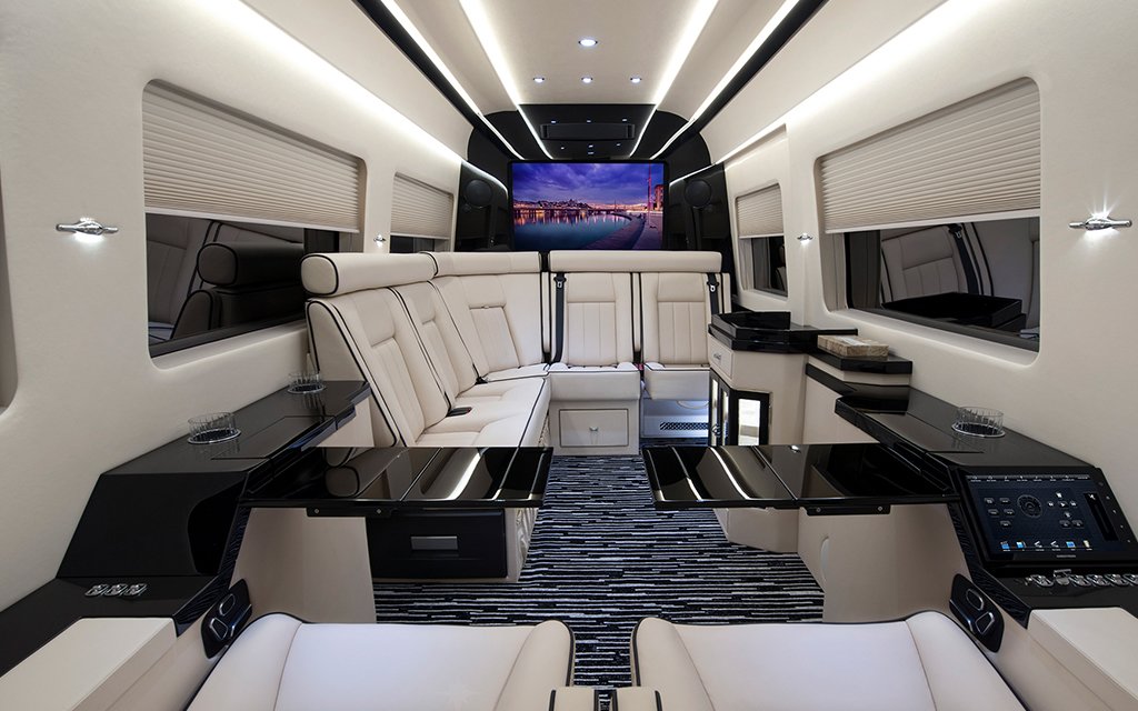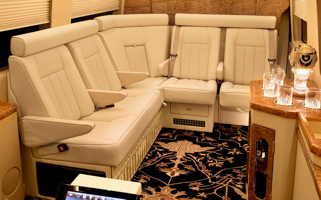 Striking wooden paneling mixed with buttery leather seats is never a bad starting point; mix in copious flat-screens, an espresso maker, full mini bar, back toilet … yeah, you’re missing that meeting. Not to mention there are even bullet- and bomb-proof mod options available, since Becker counts plenty of high-profile dignitaries and celebs among their clients.